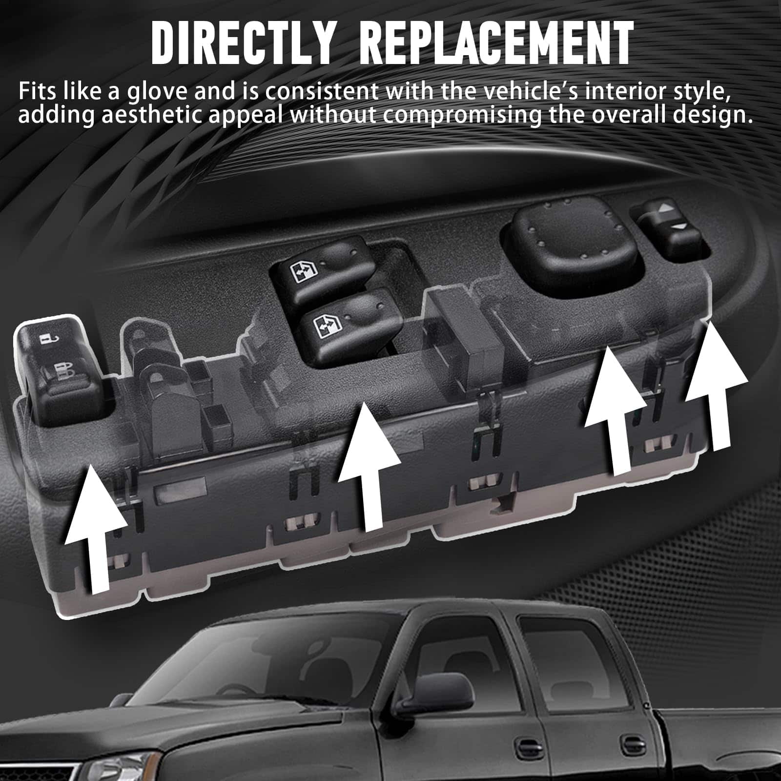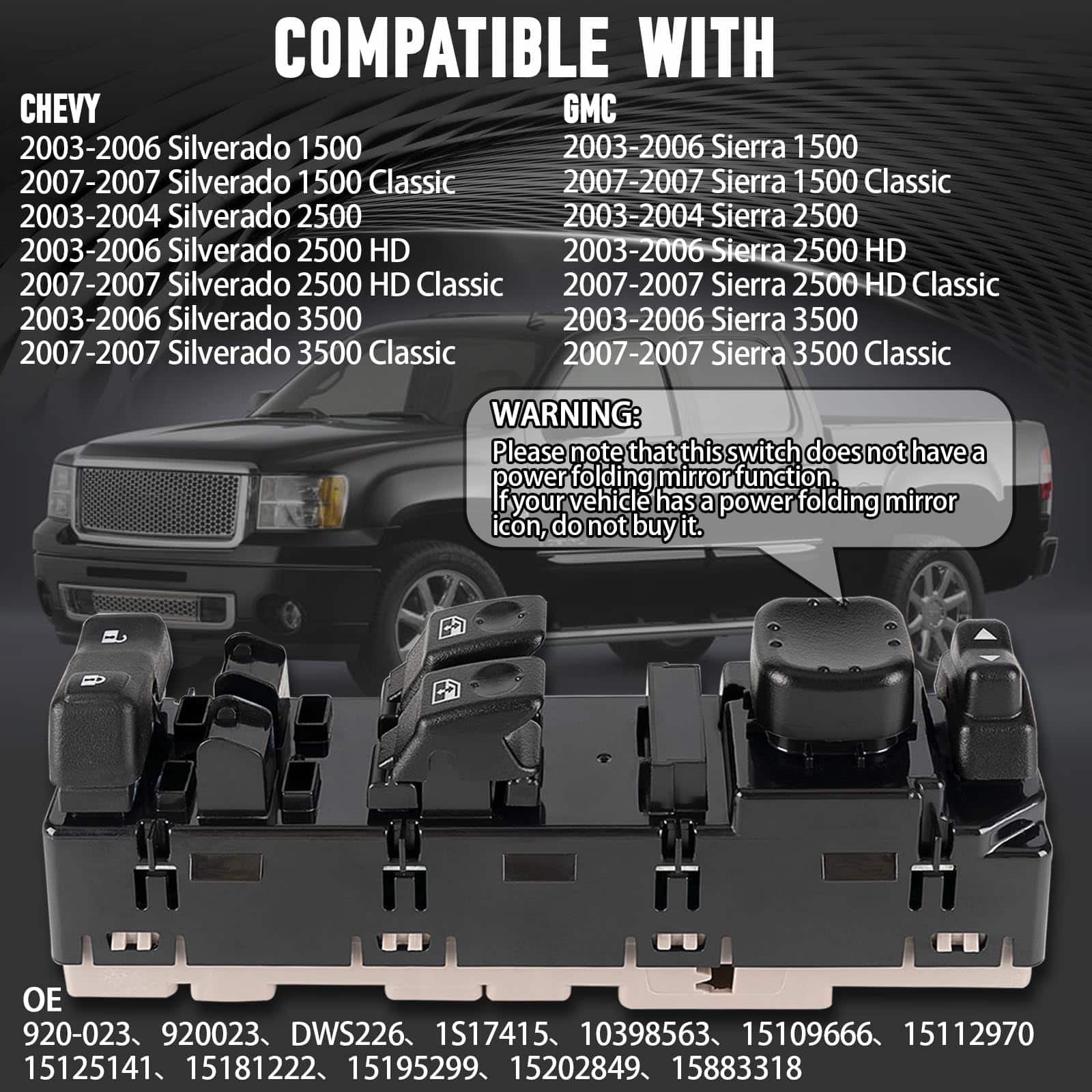 Compatible con Chevy 2003-2006 Silverado 1500 2007-2007 Silverado 1500 Classic 2003-2004 Silverado 2500 2003-2006 Silverado 2500 HD 2007-2007 Silverado 2500 HD Classic 2003-2006 Silverado 3500 2007-2007 Silverado 3500 Clásico GMC 2003-2006 Sierra1500 2007-2007 Sierra1500 Clásico 2003-2004 Siera 2500 2003-2006 Sierra 2500 HD 2007-2007 Sierra 2500 HD Classic 2003-2006 Sierra 3500 2007-2007 Sierra 3500 Clásico Nota: Por favor, verifique el número de parte antes de comprar para asegurarse de que se ajuste a su automóvil Nota: Por favor, verifique si el número de OE es el mismo, el número de botones es gráficamente idéntico, y si no viene con la función de espejo plegable eléctrico para asegurarse de que ha comprado el correcto! Paquete Incluido: 1 interruptor maestro Sobre Nosotros Nuestros productos son 100% nuevos productos de calidad, bienvenidos a comprar. Con nuestros mejores productos y mejores servicios, creemos que esta será una agradable experiencia de compra. Nos preocupamos por nuestros valiosos clientes y esperamos establecer una relación comercial a largo plazo con usted, así que por favor, ayúdenos a mejorar. Garantía de Calidad 1. Cada artículo ha sido probado en fábrica y cumple o excede las especificaciones de OEM. 2. Proporcionar un servicio. Si no está satisfecho con el producto o el producto tiene problemas de calidad, puede contactarnos en cualquier momento, le proporcionaremos una respuesta satisfactoria y resolveremos el problema postventa por usted. Damos gran importancia a la calidad y al servicio. Si tiene alguna pregunta sobre el proyecto o nuestros servicios, póngase en contacto con nosotros primero. Valoramos sus comentarios, así que nos esforzaremos por responder a todas las consultas dentro de las 24 horas. (Excepto domingos y días festivos.)