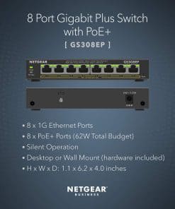 Presentamos el Switch Ethernet Inteligente Administrado Plus PoE+ NETGEAR GS308EP con 8 puertos PoE+ y un presupuesto total de PoE de 62W para alimentar aplicaciones PoE como teléfonos VoIP, cámaras IP para vigilancia, puntos de acceso inalámbricos y más. GS308EP también incluye características básicas y avanzadas de gestión de redes para ayudar a optimizar el rendimiento de las redes empresariales.