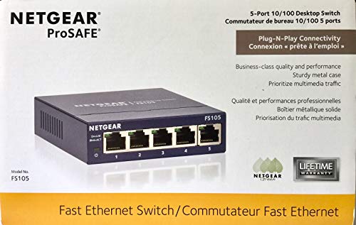 El switch Ethernet Netgear ProSafe FS105 es ideal para la oficina pequeña. Con tecnología de conmutación de 100 Mbps, este switch ofrece un rendimiento de red instantáneo mientras preserva la infraestructura de red existente, incluidos los cables instalados y el software y hardware de escritorio. Cada puerto tiene auto-detección de velocidad, lo que simplifica la instalación y permite actualizar fácilmente de 10 a 100 Mbps. Este producto incluye el switch FS105, kit de montaje en pared, adaptador de corriente, guía de instalación rápida y tarjeta de garantía. Tiene garantía de por vida.