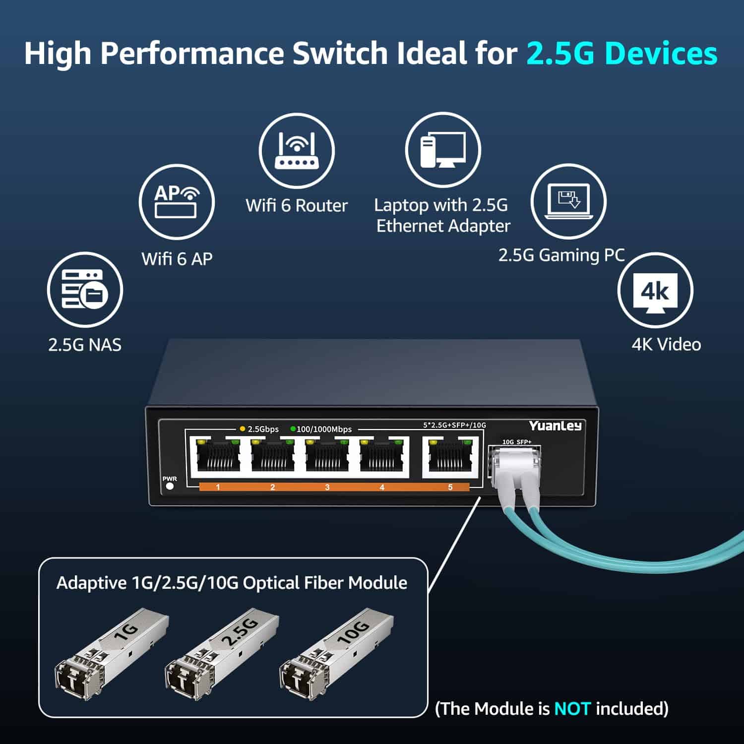 1. Switch Ethernet de 6 Puertos 2.5G El switch de red incluye 5 puertos Ethernet de 2.5 Gigabits, 1 puerto 10G SFP (Módulo Compatible 1G/2.5G, no incluye Módulo SFP). Puertos 1-5 Cumplen con el estándar IEEE IEEE802.3bz (2.5G), soporta adaptación 10/100/1000M/2.5G, Auto MDI/MDIX. 2. Velocidades de Red Rápidas Este switch de red ofrece un rendimiento de red 2.5 veces más rápido que los switches Gigabit tradicionales. Con una capacidad de conmutación de hasta 60Gbps, este switch de red puede manejar grandes cantidades de tráfico de datos, asegurando un funcionamiento suave y eficiente de la red. 3. Plug and Play Switch Ethernet de 2.5Gbps sin gestión, simplemente conecte el cable de alimentación, conecte el cable Ethernet a su dispositivo y es fácil de usar sin necesidad de ninguna configuración. 4. Estable y Silencioso Carcasa de metal duradera con protección contra rayos de 6KV, diseño silencioso sin ventilador para un ahorro de energía mayor, agujeros de refrigeración de doble lado, amplio rango de temperatura -10~50°C, luces indicadoras LED, operación estable, fácil de mantener el estado de red. 5. Ampliamente Utilizado Soporta montaje en pared y colocación en escritorio. Ampliamente utilizado en diferentes entornos de redes, como NAS de 2.5G, video 4K, PC para juegos, Servidor 2.5G, WiFi 6 AP de 2.5G, Adaptador PCIe de 2.5G y más.