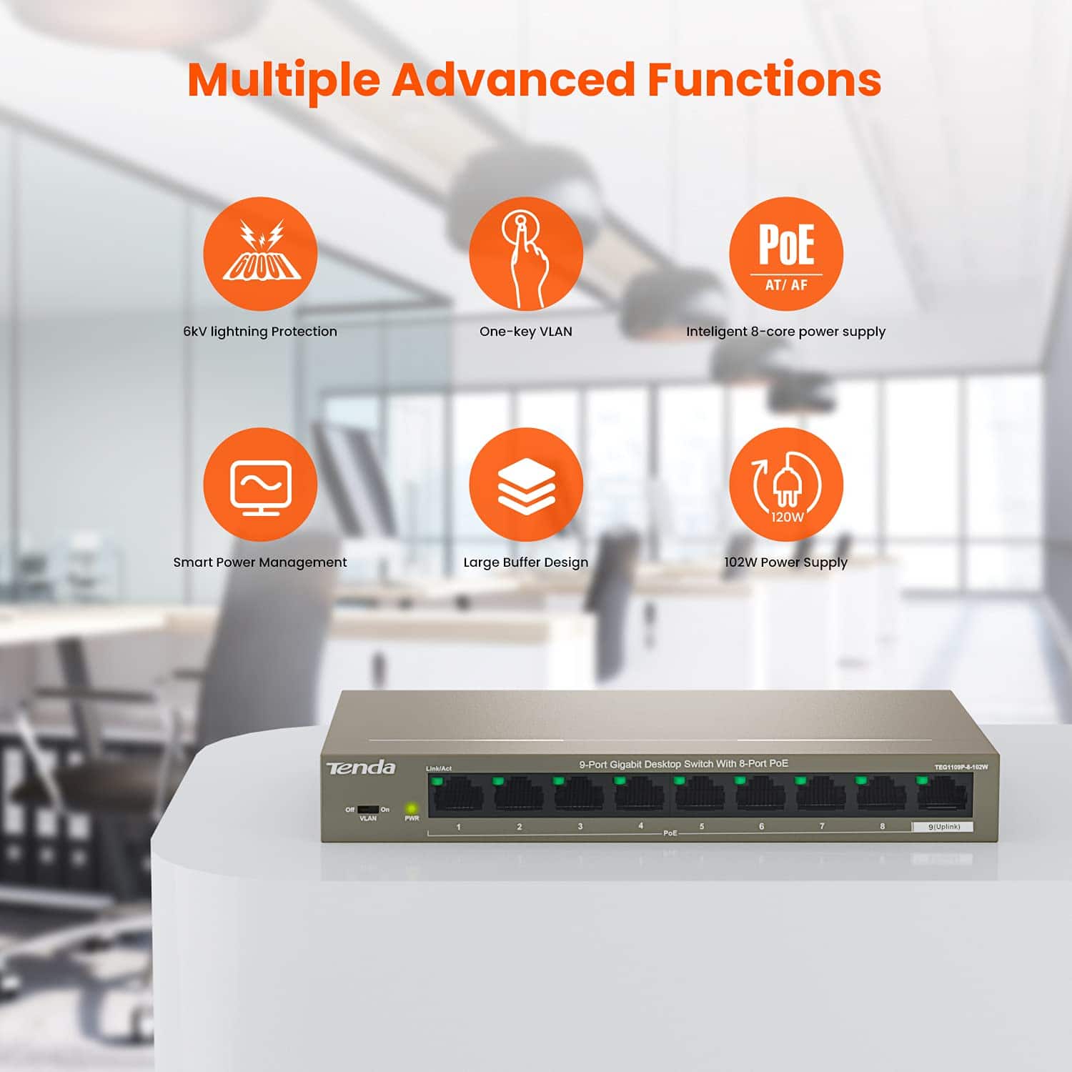 TEG1109P-8-102W es el switch PoE gigabit no administrado especialmente desarrollado por Tenda para las necesidades de construir una red de vigilancia de WLAN Gigabit y cámaras HD. Con acceso de alto rendimiento, 9 puertos Ethernet RJ45 de 10/100/1000; resistente a rayos de 6KV para montaje en puerta; Cada puerto compatible con MDI / MDIX y velocidad cableada Con cable trenzado estándar Cat 5e puede transmitirse con datos de AP, cámara IP y teléfono IP. Y la fuente de alimentación PoE dinámica, una configuración más simple, una extensión de red flexible sin verse limitado por el diseño de la línea de alimentación, plug and play….. Todo lo anterior ayuda a las PYMEs, hoteles, centros comerciales, escuelas a crear una red de cobertura inalámbrica de alta seguridad y confiable y monitoreo HD.
