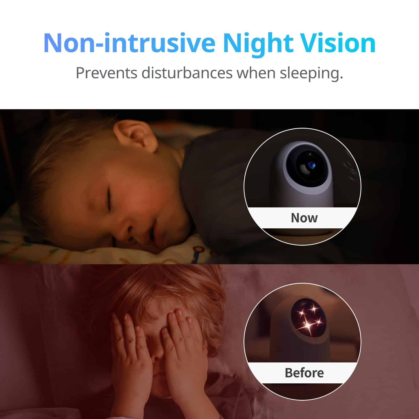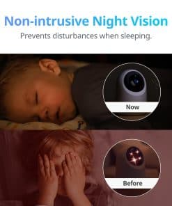 2. Imágenes más claras, tanto de día como de noche: Ahora puedes ver imágenes coloridas incluso en ambientes de poca luz durante más tiempo. Equipada con 8 LED infrarrojos, la visión nocturna puede alcanzar hasta 10 metros con imágenes claras. La luz infrarroja invisible de 940nm también significa que no habrá molestias al dormir, por lo que es perfecta incluso para habitaciones de bebés.