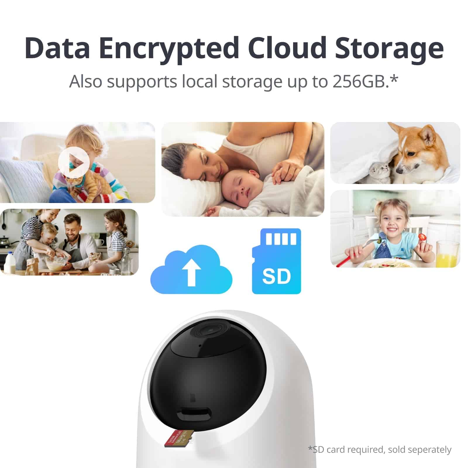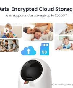 6. Opciones flexibles de almacenamiento: Hay dos formas diferentes de almacenar imágenes, localmente o a través de la nube. El almacenamiento local es compatible con tarjetas SD de hasta 256GB, y la grabación continua puede durar hasta 512 horas. El almacenamiento en la nube adopta la Tecnología de Encriptación AES-128 para garantizar la seguridad y también viene con una prueba gratuita de 14 días. Activa la grabación continua o por eventos para grabar las actividades de mascotas y niños en casa y reproducirlas en cualquier momento, cada momento es un recuerdo.