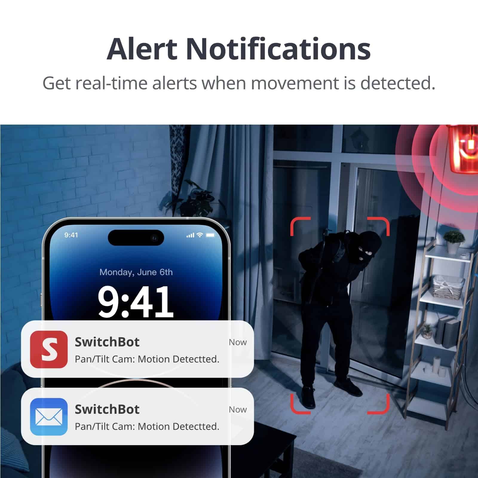 4. Detección de IA con alarmas intuitivas: Nuestra cámara de seguridad interior está equipada con tecnología de reconocimiento humano de IA, para detectar movimiento con tres ajustes de sensibilidad para evitar errores de reconocimiento. Una vez capturado el movimiento, tu cámara comenzará inmediatamente a rastrear y grabar la actividad de cualquier objeto a la vista, y enviará alertas en tiempo real a ti, asegurando que no te pierdas nada importante.