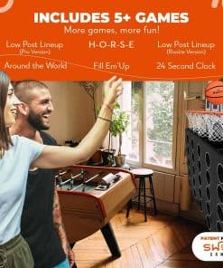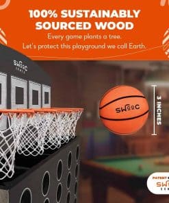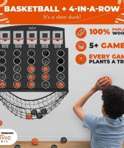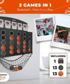 BASKETBALL + 4 EN LÍNEA – Lanza a la canasta y juega al 4 en línea gigante en esta emocionante versión para el hogar. Esta decoración interactiva (26 x 32 pulgadas) se puede montar en cualquier lugar interior y jugar al instante para acción de mini baloncesto de 1 contra 1 o 2 contra 2. ¡Es hora de jugar! 5+ FORMAS DE JUGAR – Comienza como un Novato y avanza hasta la versión de Pro Basketball 4 En Línea. O juega giros exclusivos de SWOOC en los clásicos como Horse & Around the World. ¡Nunca te aburras con juegos como 24 Second Clock, Fill ‘Em Up, y más! ENTRETENIMIENTO PARA TODAS LAS EDADES – Niños y adultos adorarán la acción rápida para todas las edades y niveles de habilidad. Con mini pelotas de 3 pulgadas (13 naranjas y 13 negras), es el regalo perfecto para los amantes del baloncesto. Juega en la sala de juegos, garaje, etc. ¡Una clavada! MADERA DE POPLAR DE NUEVA ZELANDA OBTENIDA DE MANERA SOSTENIBLE: Garantizada para no partirse, agrietarse, torcerse o deformarse. Hecho de la mejor calidad de madera de Álamo de los bosques sostenibles de Nueva Zelanda. Construido para resistir incluso los enfrentamientos más intensos. CADA JUEGO PLANTA UN ÁRBOL: En asociación con Trees for the Future, una organización 501(c)(3), SWOOC Games plantará un árbol por cada pedido. Cada juego incluye un certificado del árbol que plantaste. Protejamos este patio de recreo que llamamos Tierra.