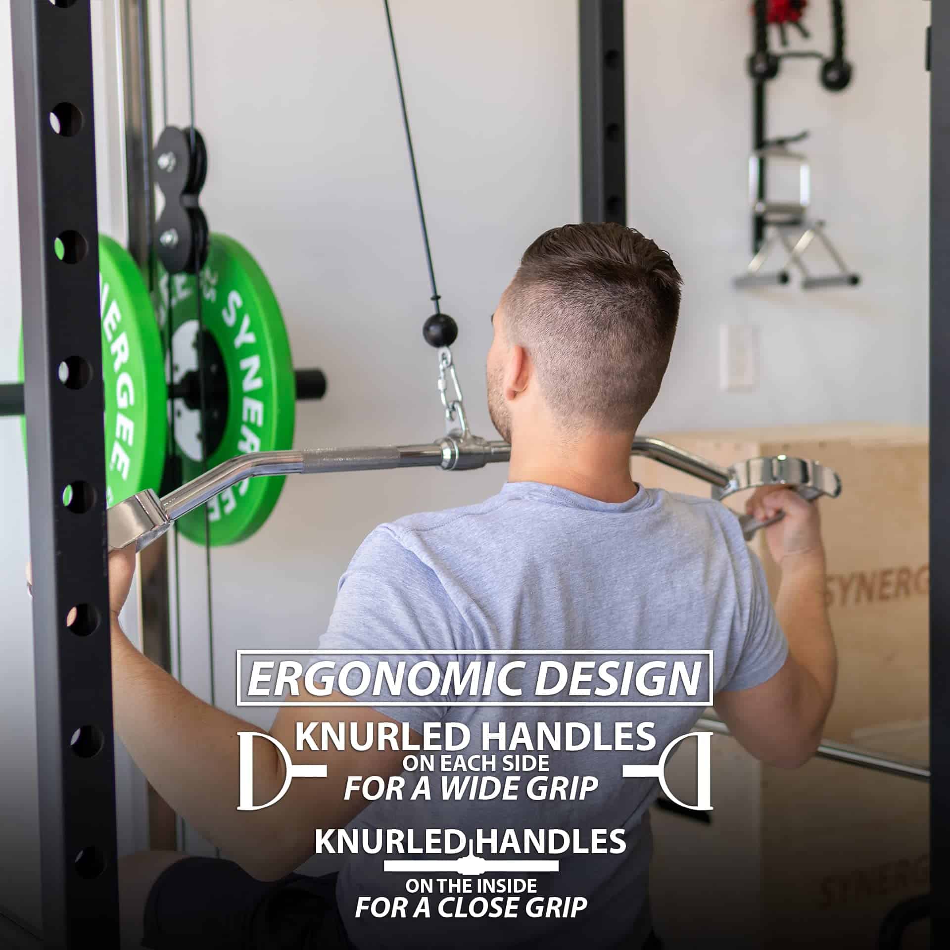 1. FUERTE Y VERSÁTIL Nuestros Accesorios de Cable de Barra Synergee Pro Style Lat están hechos con acero de alta calidad. Además, están recubiertos con cromo para resistir la oxidación y aumentar la longevidad de tu barra. Los mangos exteriores estriados y la barra interior ofrecen varias opciones de agarre antideslizante para desarrollar tus dorsales, trapecios, romboides y músculos serratos.