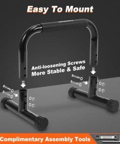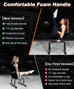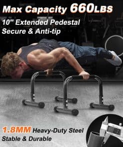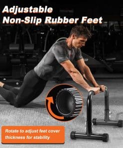 Las barras parallettes proporcionan una altura ideal de 12 pulgadas para principiantes, intermedios o profesionales avanzados en gimnasia, entrenamiento con pesas en lugar de 9 pulgadas, convirtiéndolo en un excelente equipo de calistenia para gimnasios caseros. Perfecto para hacer flexiones estándar, flexiones anchas, L-sit, dips, handstands y entrenamiento de fuerza del tren superior, etc. El asa de espuma ergonómica de cobertura completa le brinda suficiente espacio de agarre. La espuma de 1.5» de grosor es cómoda de agarrar y reduce la fatiga de las manos. El material de alta densidad evita efectivamente el deslizamiento y ofrece un excelente agarre incluso con manos sudorosas. La cubierta del pie inferior está hecha de material de goma premium, ideal para antideslizante. Y el diseño único de diferentes grosores de la cubierta del pie se rota para ajustar el equilibrio de la base, incluso en terreno irregular. Con todo el hardware necesario que necesita, puede instalar y desmontarlos en 1 minuto rápidamente, lo cual es muy conveniente para llevarlos contigo a exteriores o al gimnasio, y fácil de almacenar. Para todas las barras de flexiones TABEKE, la medida y la capacidad son el resultado real. Ordene hoy y obtenga una cobertura de 180 días en la barra. Si encuentra algún problema, contáctenos en cualquier momento y le responderemos en 24 horas. Haremos todo lo posible para ayudarlo a resolver el problema.