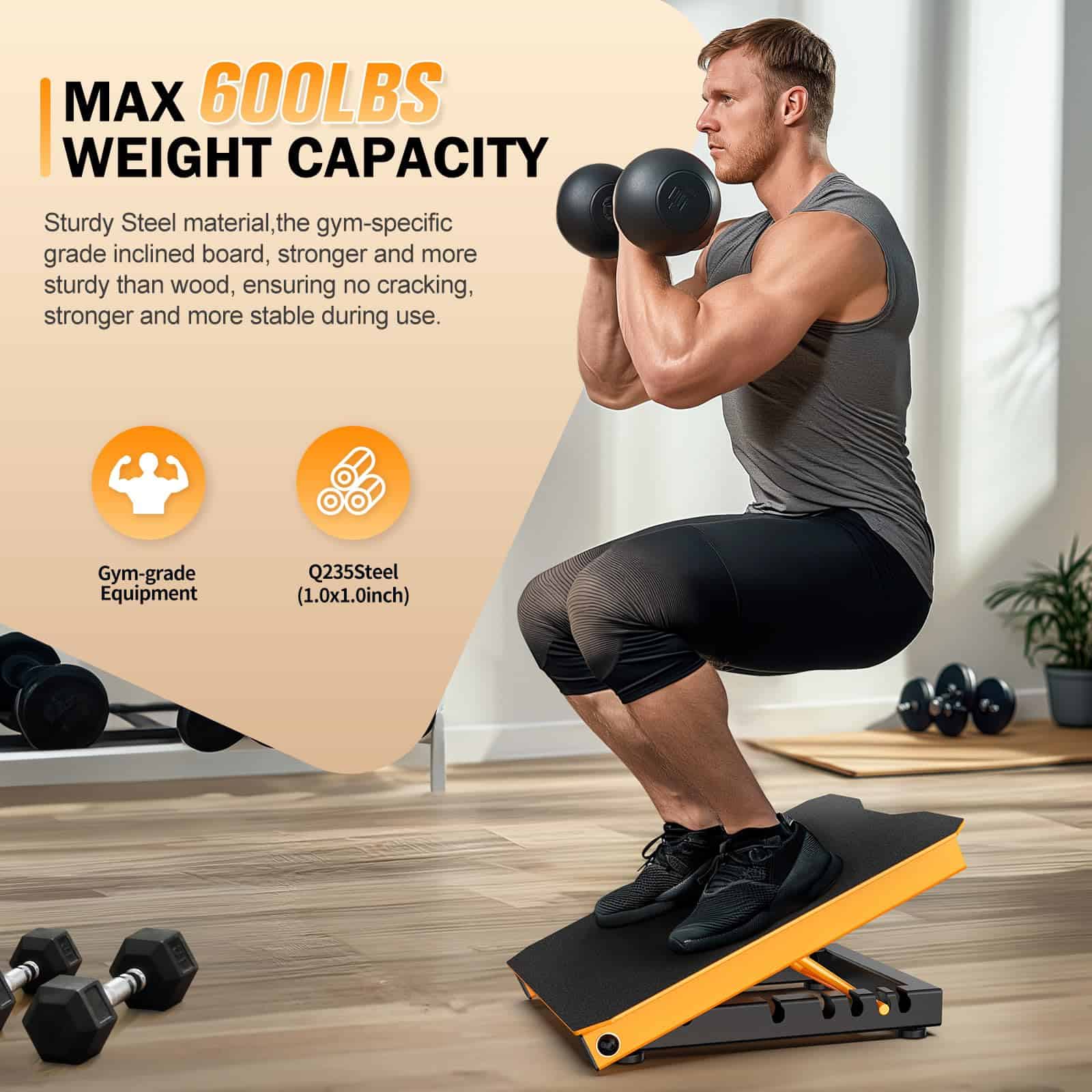 Tablero de inclinación resistente: Fabricado en material de acero resistente, pesa 11.3 libras, capacidad máxima de peso de 600 lbs, pertenece al grado profesional de tablero inclinado específico para gimnasio, más fuerte y más resistente que la madera, asegurando que no se agriete, más fuerte y más estable durante el uso.