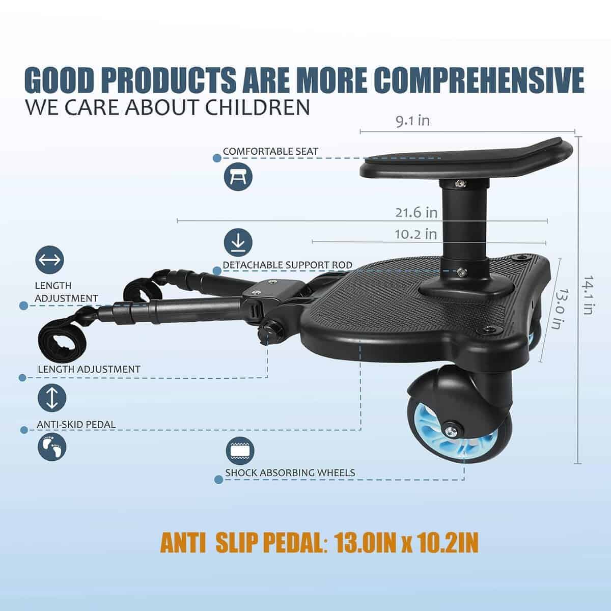 5. Seguro y Confiable Hecho de material ecológico PP, diseñado profesionalmente, resistente y duradero, y puede soportar de manera segura a niños con un peso de hasta 55 libras. Las ruedas de alta calidad utilizadas hacen que el paseo sea más suave y reducen el ruido. El diseño antideslizante en la tabla para cochecito garantiza una experiencia de conducción segura y cómoda.