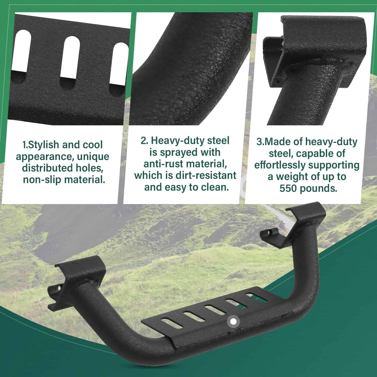 Están diseñadas para entusiastas del aire libre que buscan conquistar terrenos escarpados y rocosos, mejorando la apariencia resistente todoterreno del Bronco con su diseño único y elegante. Proporcionan protección efectiva en caso de colisiones, reduciendo el riesgo de daños en la puerta y otros riesgos potenciales. Facilitan que todos puedan entrar a la cabina y facilitan la limpieza del techo y el transporte de carga en el techo. Mejora la funcionalidad de tu Bronco con nuestros Pasos Laterales Desplegables, construidos con placas de acero de 2.0″ de servicio pesado que soportan hasta 300 lbs. Son resistentes a la corrosión y al óxido gracias a su recubrimiento en polvo texturizado. Este producto viene con una garantía de fábrica de 1 año y soporte de servicio al cliente de por vida. Incluye instrucciones de instalación. Si tienes más preguntas o inquietudes, no dudes en ponerte en contacto con nosotros.