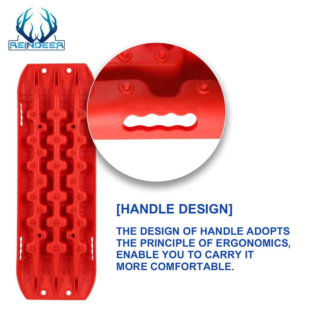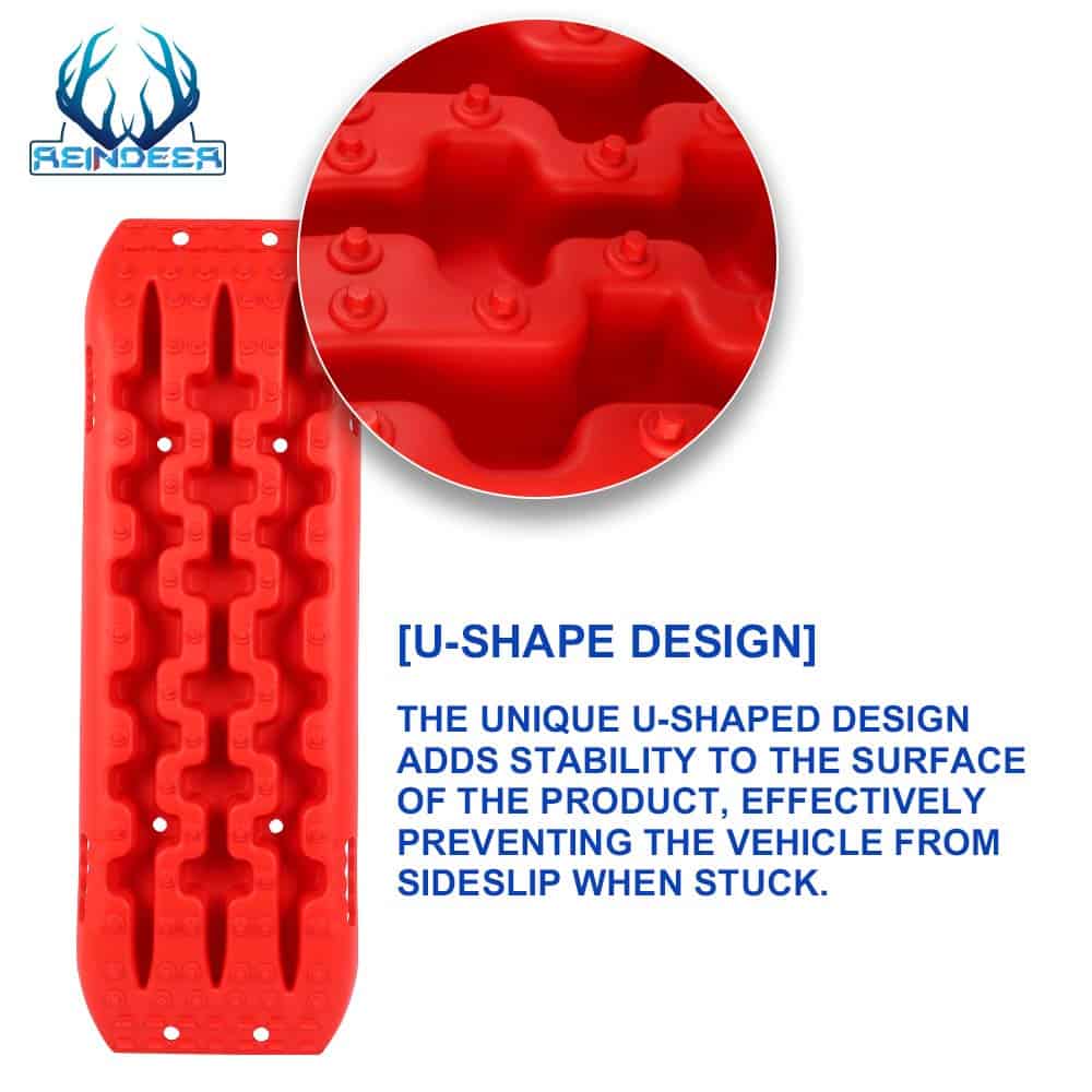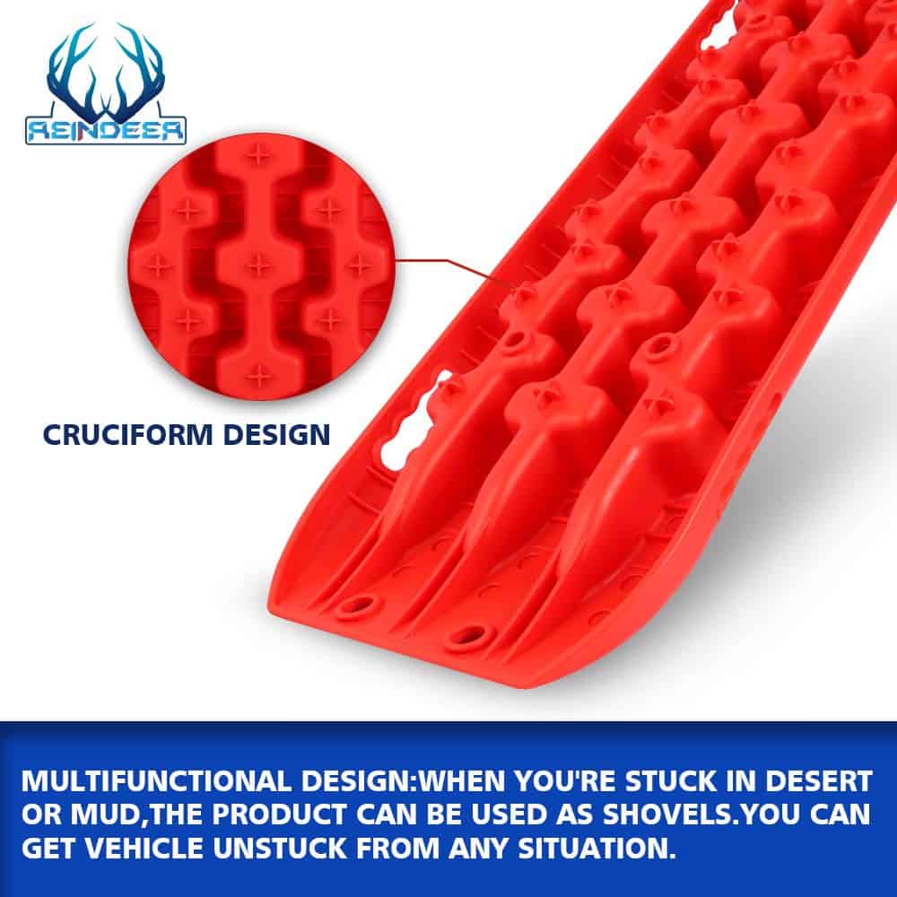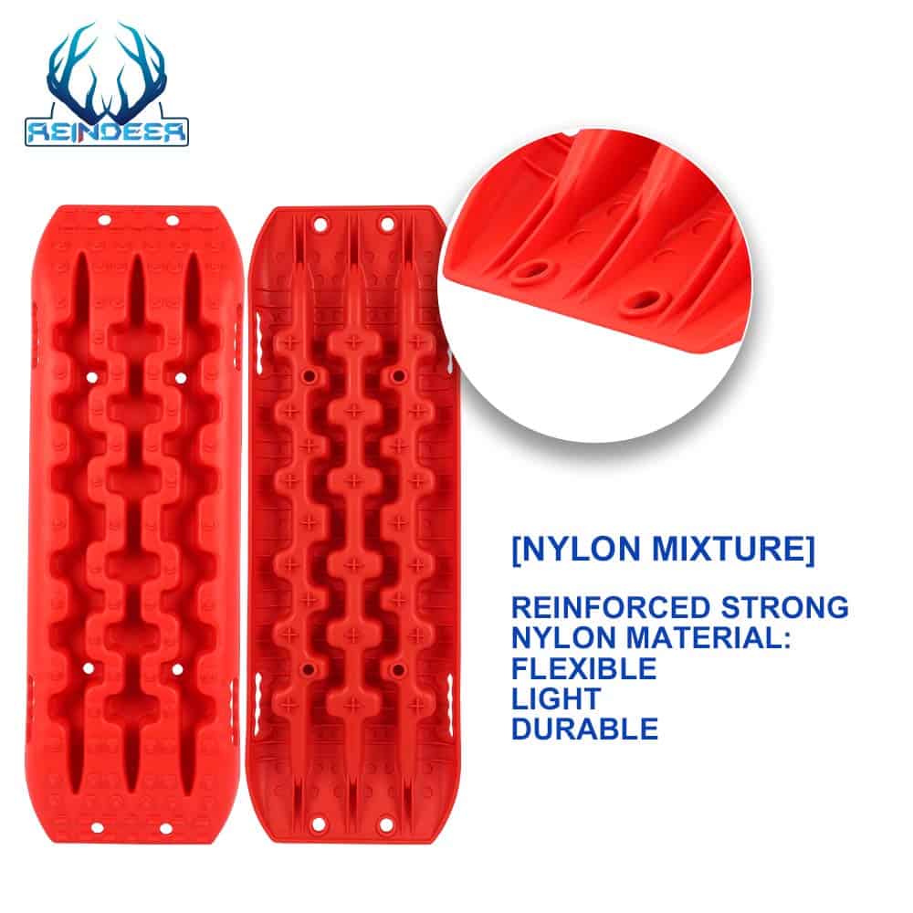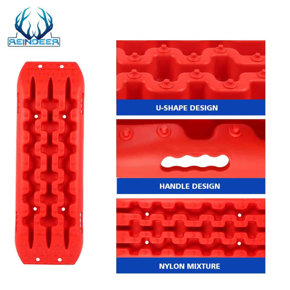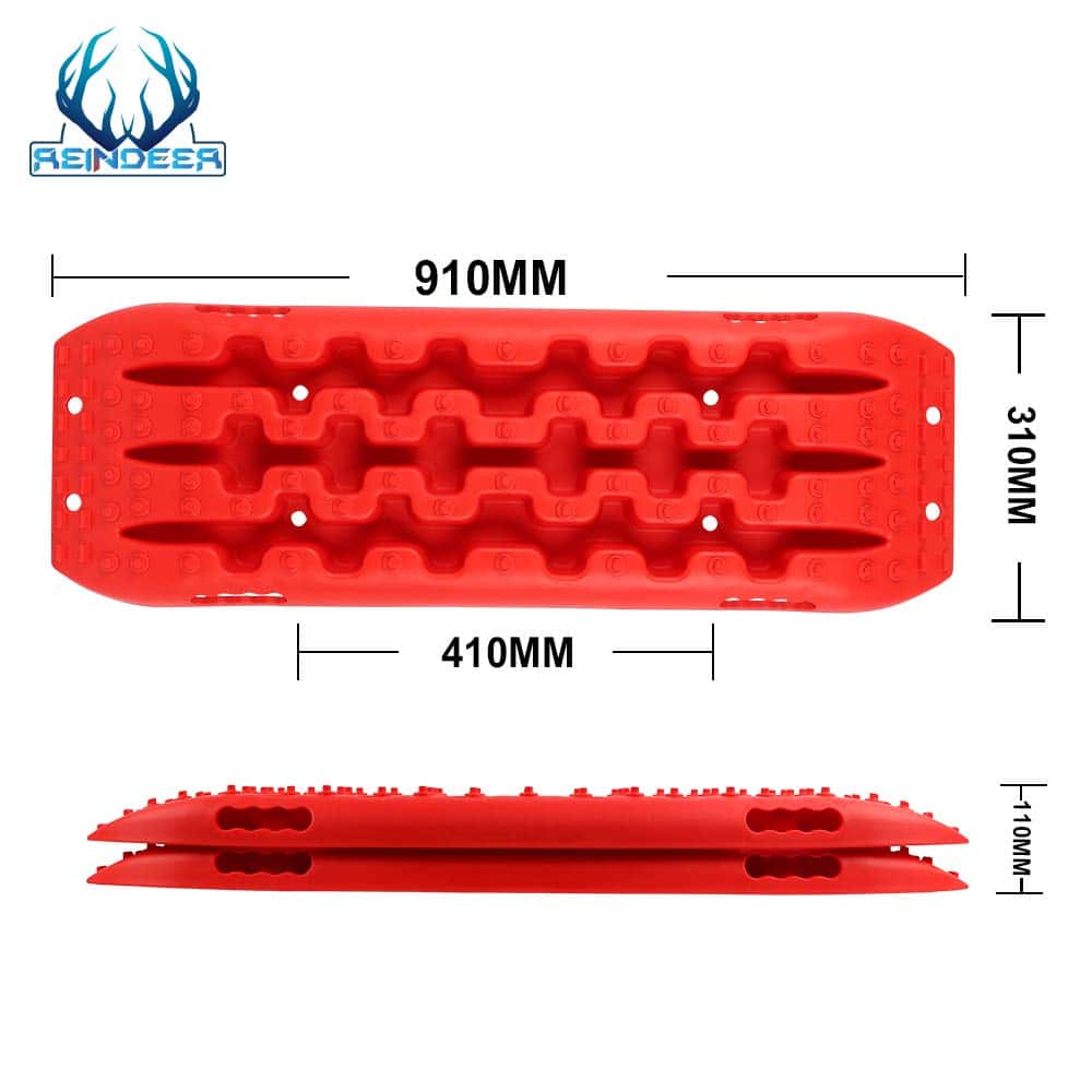 Tablas de Recuperación de Tracción REINDEER para vehículos 4X4 en terrenos off-road como arena, nieve o lama. Estas tablas están diseñadas para proporcionar tracción adicional a tus neumáticos en situaciones donde te has quedado atascado. Marca: REINDEER. Condición: Nuevo. Color: Rojo. Dimensiones: 36 x 12.2 x 4.7 pulgadas. Peso: 10.3 libras por par. Capacidad de carga: 10 Toneladas. Material: Nylon reforzado resistente.