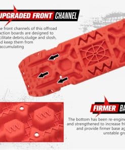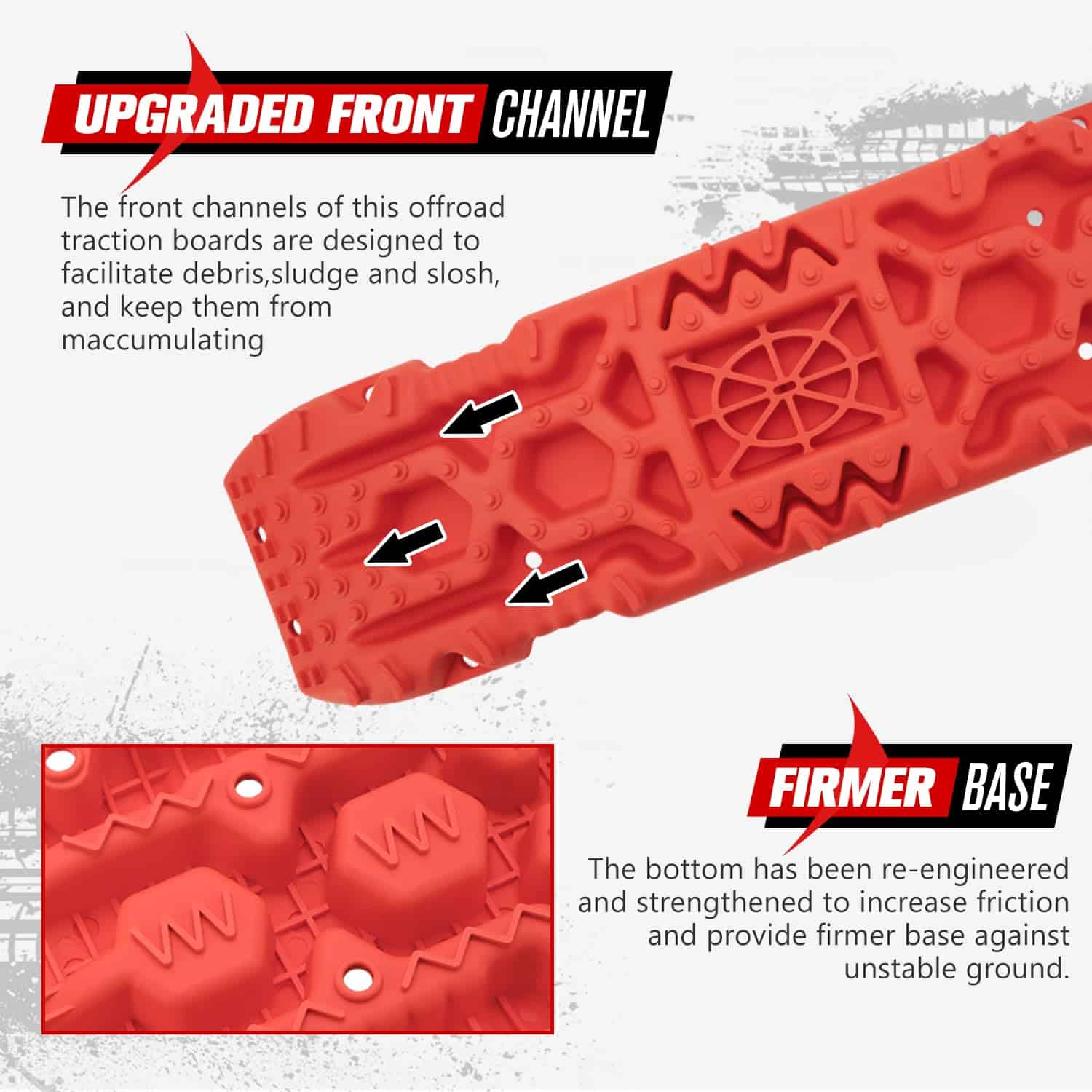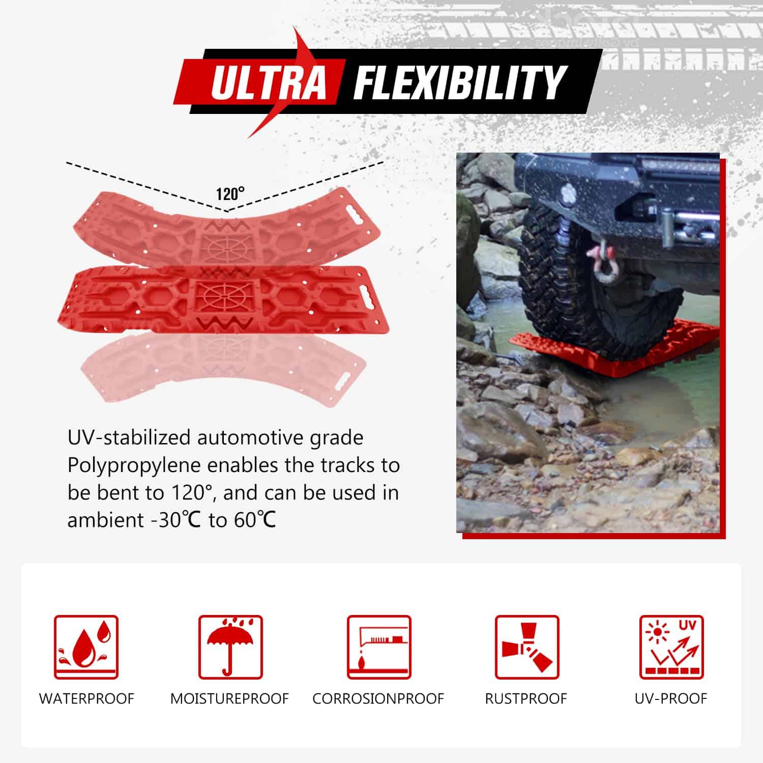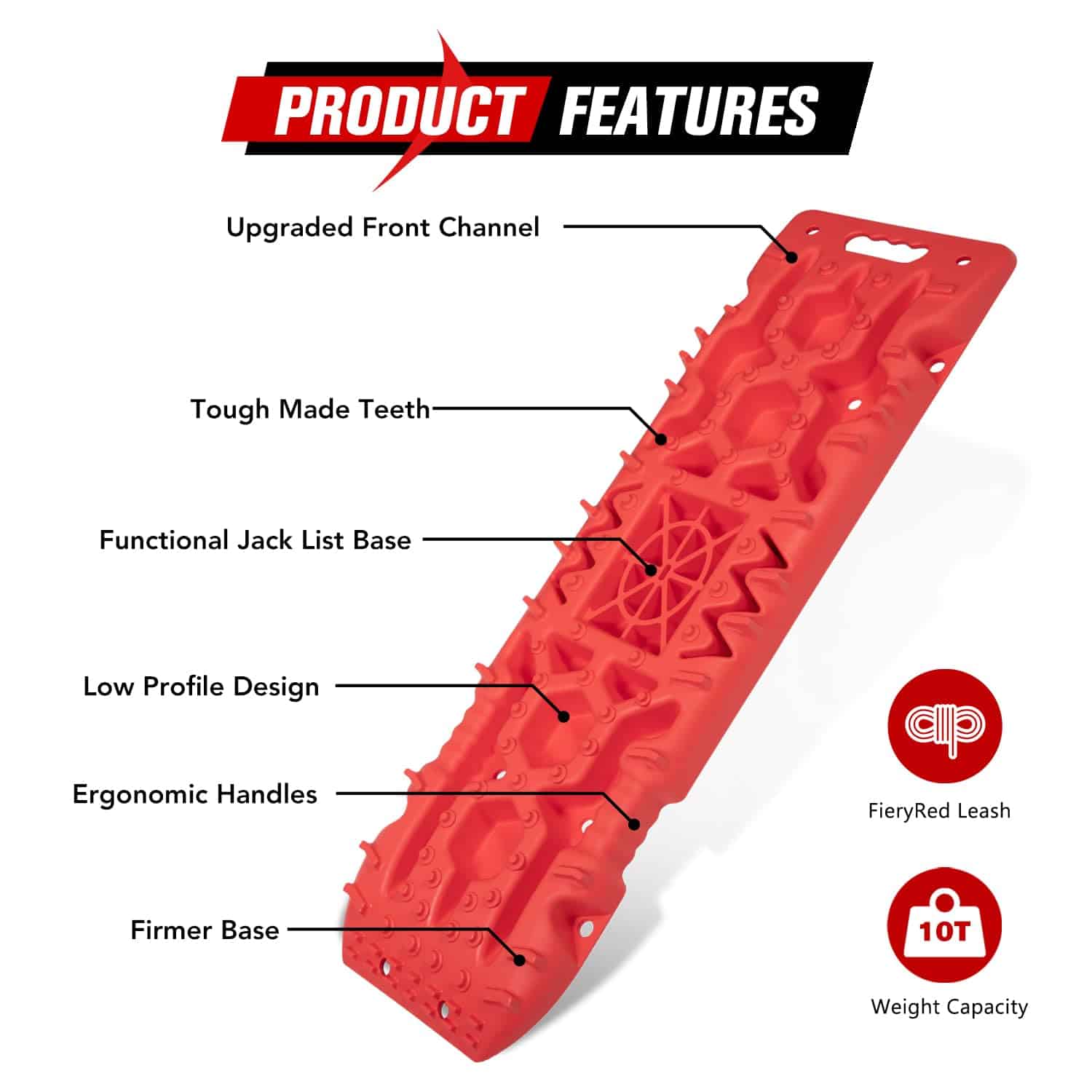 2. Construcción Sólida: Cada rampa puede soportar hasta 10 TONELADAS y puede doblarse hasta 120 . Pueden usarse en un rango de temperatura de -22 ~140 . La tabla principal de las tablas de tracción FieryRed está hecha de polipropileno de alta calidad estabilizado con UV de grado automotriz para ofrecer mejor tracción y durabilidad, y garantizar un rendimiento confiable durante la recuperación.