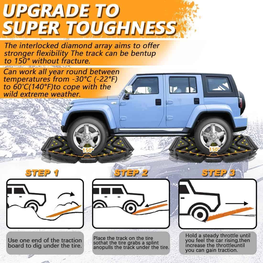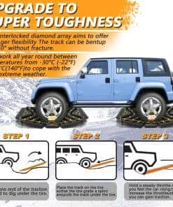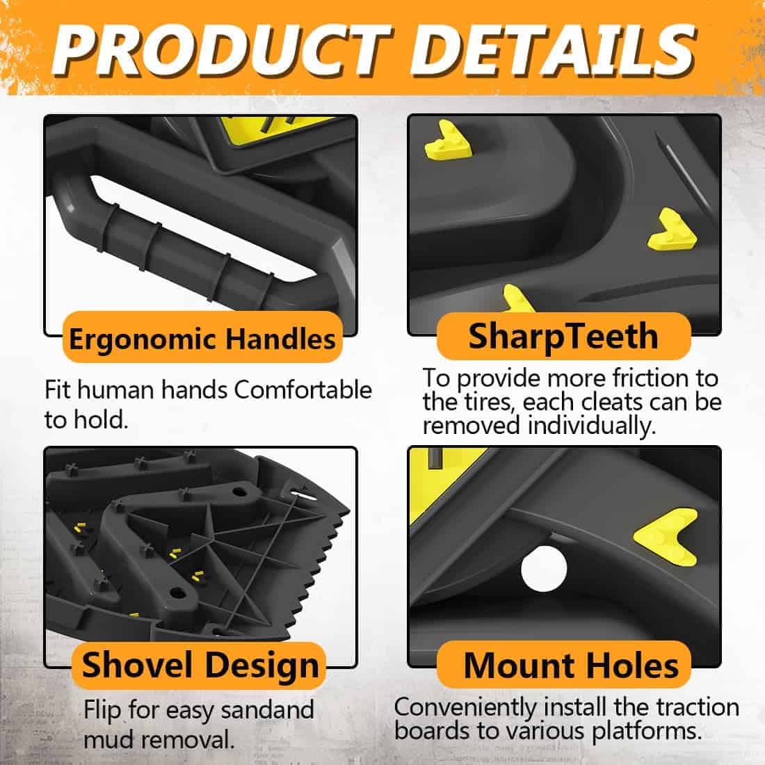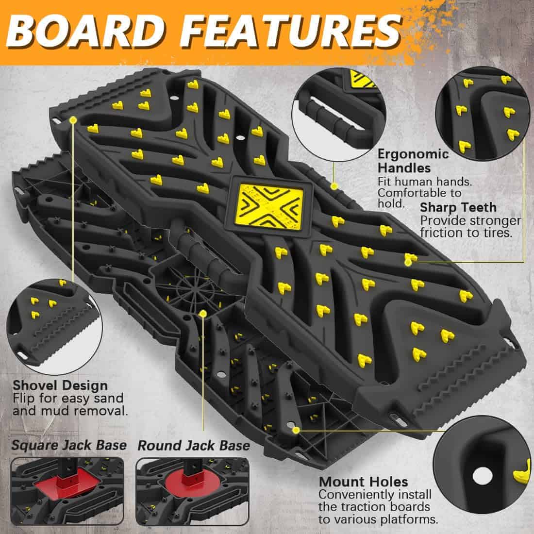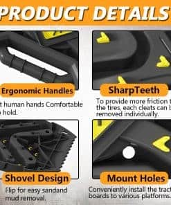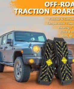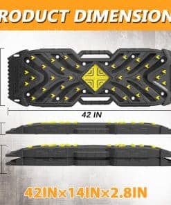 Fabricadas con nylon endurecido de alta resistencia, las Tablas de Tracción ofrecen una durabilidad excepcional y resistencia al impacto, garantizando un rendimiento de recuperación superior en arena, barro y nieve. Diseñadas para soportar cargas pesadas, estas Tablas de Rescate resisten grietas, deformaciones y exposición UV, lo que las hace ideales para condiciones extremas fuera de carretera. Ya sea que estés navegando por senderos rocosos o dunas profundas, estos Tableros de Recuperación brindan confiabilidad duradera. Equipadas con 34 púas antideslizantes de alta resistencia, estos Tableros de Recuperación maximizan el agarre de la llanta, evitando el giro de las ruedas en terrenos difíciles. Cada púa es desmontable y reemplazable, asegurando una usabilidad a largo plazo incluso en condiciones frecuentes de recuperación fuera de carretera. Ya sea enfrentando barro, arena o nieve, estas Traction Boards brindan tracción inigualable, ayudándote a recuperar el control sin esfuerzo. Voltea estas Pistas de Recuperación para utilizar el diseño de pala integrada, lo que te permite eliminar fácilmente el exceso de arena, barro o nieve. La compatibilidad única con la base del gato asegura una estabilidad adicional al utilizar un gato hidráulico para la recuperación o reparación del vehículo. Estos tableros de tracción todoterreno son imprescindibles para overlanders, aventureros y asistencia en carretera de emergencia. Diseñadas para la conveniencia del usuario, estas Tablas de Tracción cuentan con asas ergonómicas para un agarre cómodo y fácil portabilidad. Los agujeros pretaladrados permiten la instalación sin problemas en portaequipajes de techo, portaequipajes y exteriores de vehículos, facilitando el almacenamiento y transporte. Ya sea que estés conduciendo fuera de carretera con un ATV, UTV, SUV o camión 4×4, estos Tableros de Recuperación están diseñados para una accesibilidad sobre la marcha. Con una medida de 42 pulgadas de largo y 14 pulgadas de ancho, estos Tableros de Recuperación de gran tamaño soportan vehículos pesados a través de terrenos desafiantes. El diseño de alta visibilidad en dos tonos garantiza que puedas localizarlos rápidamente en condiciones difíciles. Además, la correa de recuperación naranja neón permite una fácil recuperación cuando están enterrados en barro o arena, convirtiendo estas almohadillas de tracción todoterreno en esenciales para cualquier aventura. ¡Perfecto para recuperación fuera de carretera y preparación para emergencias!