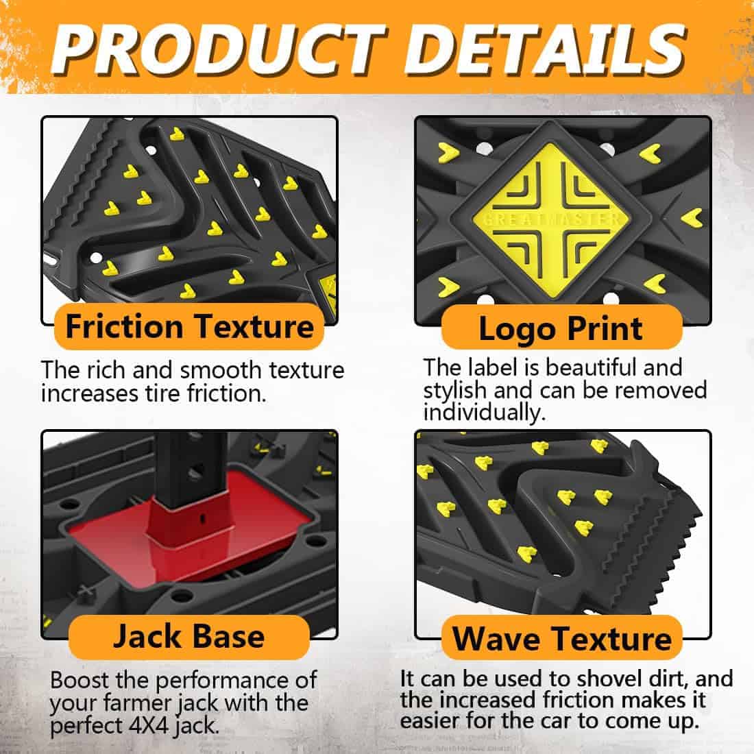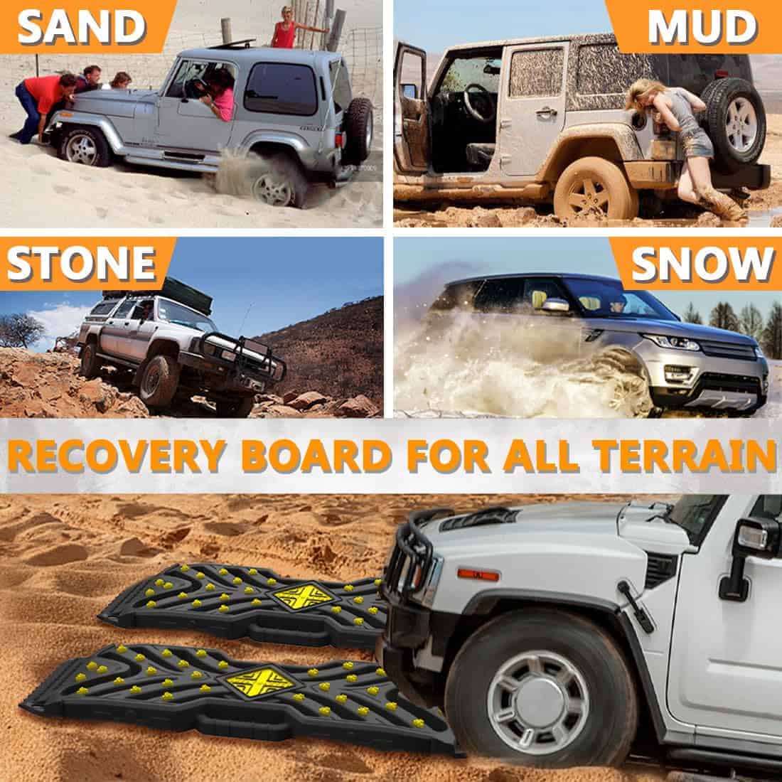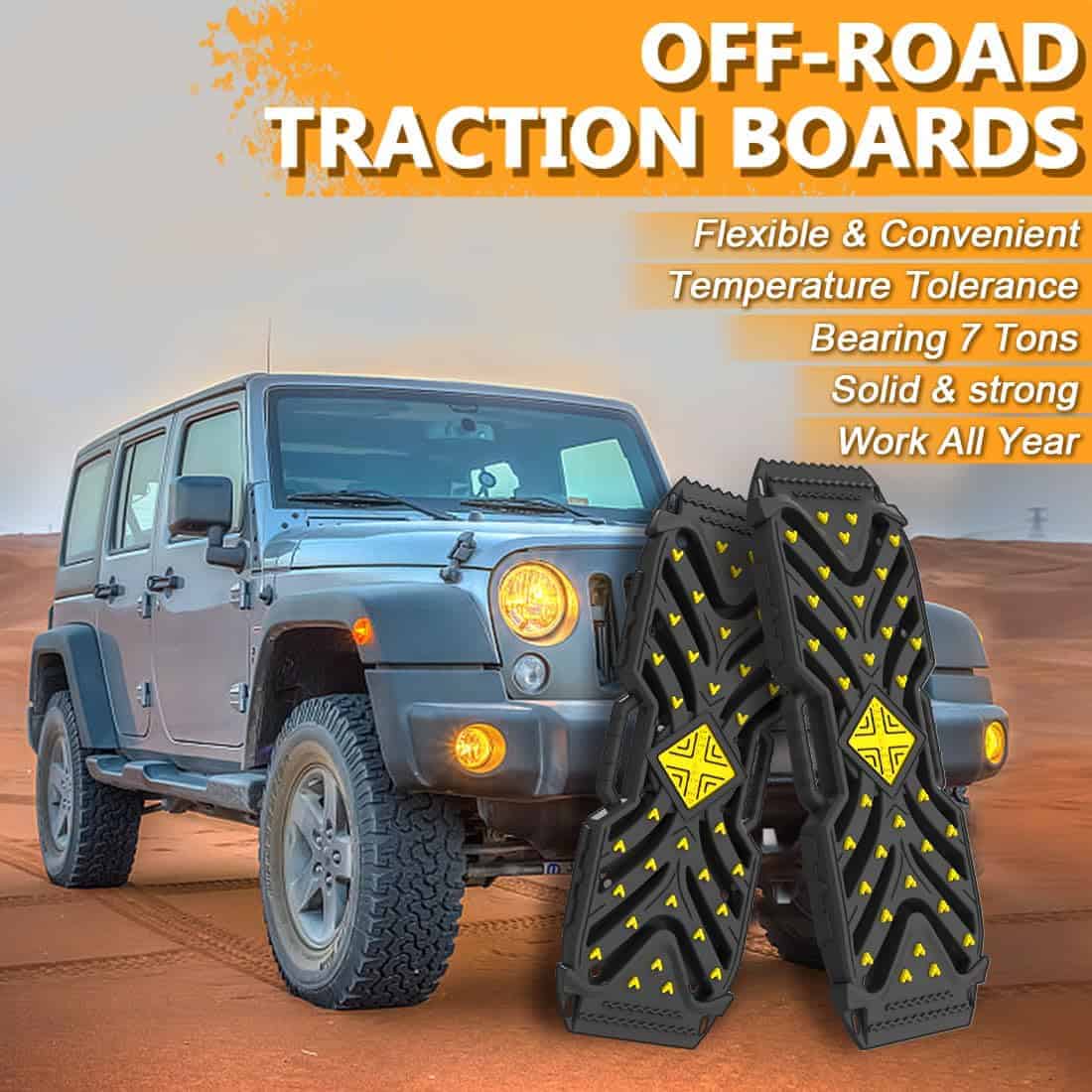 Fabricadas con nylon endurecido de alta resistencia, las Tablas de Tracción ofrecen una durabilidad excepcional y resistencia al impacto, garantizando un rendimiento de recuperación superior en arena, barro y nieve. Diseñadas para soportar cargas pesadas, estas Tablas de Rescate resisten grietas, deformaciones y exposición UV, lo que las hace ideales para condiciones extremas fuera de carretera. Ya sea que estés navegando por senderos rocosos o dunas profundas, estos Tableros de Recuperación brindan confiabilidad duradera. Equipadas con 34 púas antideslizantes de alta resistencia, estos Tableros de Recuperación maximizan el agarre de la llanta, evitando el giro de las ruedas en terrenos difíciles. Cada púa es desmontable y reemplazable, asegurando una usabilidad a largo plazo incluso en condiciones frecuentes de recuperación fuera de carretera. Ya sea enfrentando barro, arena o nieve, estas Traction Boards brindan tracción inigualable, ayudándote a recuperar el control sin esfuerzo. Voltea estas Pistas de Recuperación para utilizar el diseño de pala integrada, lo que te permite eliminar fácilmente el exceso de arena, barro o nieve. La compatibilidad única con la base del gato asegura una estabilidad adicional al utilizar un gato hidráulico para la recuperación o reparación del vehículo. Estos tableros de tracción todoterreno son imprescindibles para overlanders, aventureros y asistencia en carretera de emergencia. Diseñadas para la conveniencia del usuario, estas Tablas de Tracción cuentan con asas ergonómicas para un agarre cómodo y fácil portabilidad. Los agujeros pretaladrados permiten la instalación sin problemas en portaequipajes de techo, portaequipajes y exteriores de vehículos, facilitando el almacenamiento y transporte. Ya sea que estés conduciendo fuera de carretera con un ATV, UTV, SUV o camión 4×4, estos Tableros de Recuperación están diseñados para una accesibilidad sobre la marcha. Con una medida de 42 pulgadas de largo y 14 pulgadas de ancho, estos Tableros de Recuperación de gran tamaño soportan vehículos pesados a través de terrenos desafiantes. El diseño de alta visibilidad en dos tonos garantiza que puedas localizarlos rápidamente en condiciones difíciles. Además, la correa de recuperación naranja neón permite una fácil recuperación cuando están enterrados en barro o arena, convirtiendo estas almohadillas de tracción todoterreno en esenciales para cualquier aventura. ¡Perfecto para recuperación fuera de carretera y preparación para emergencias!