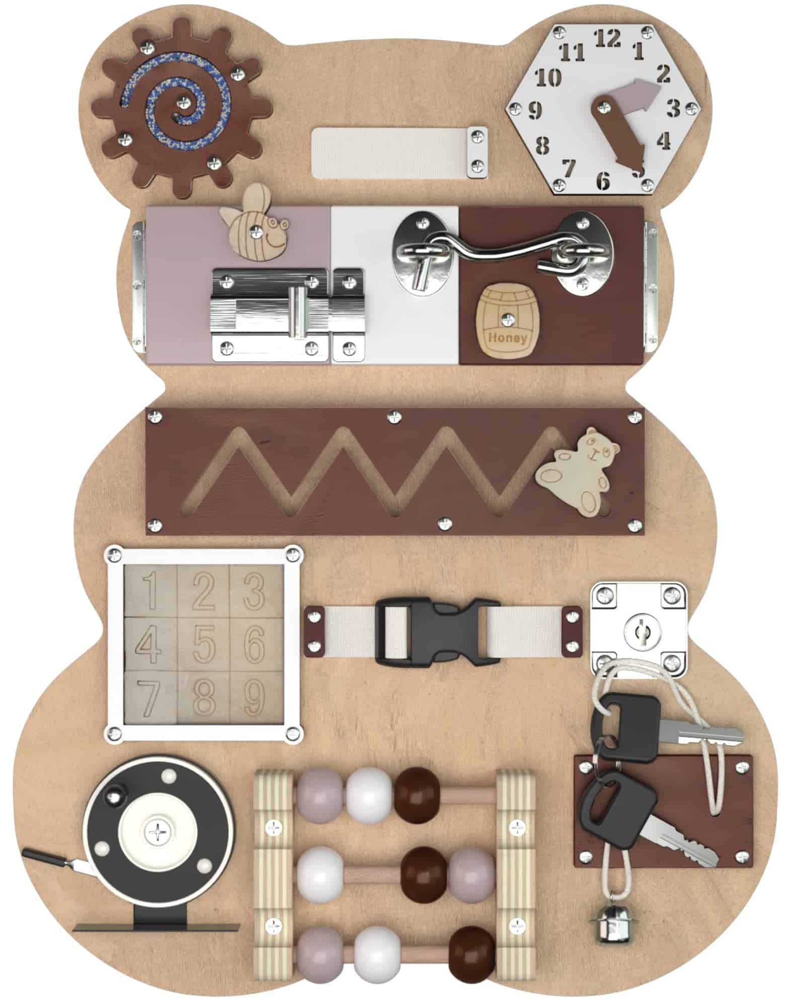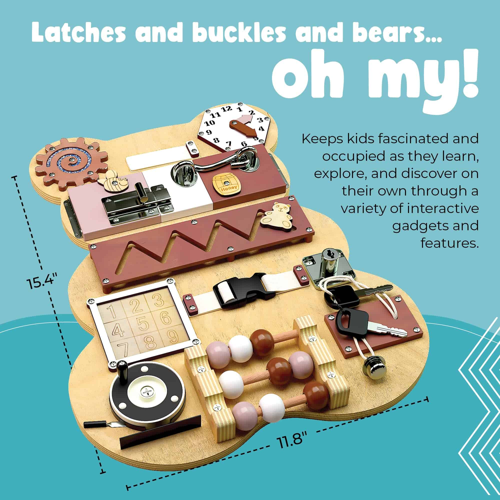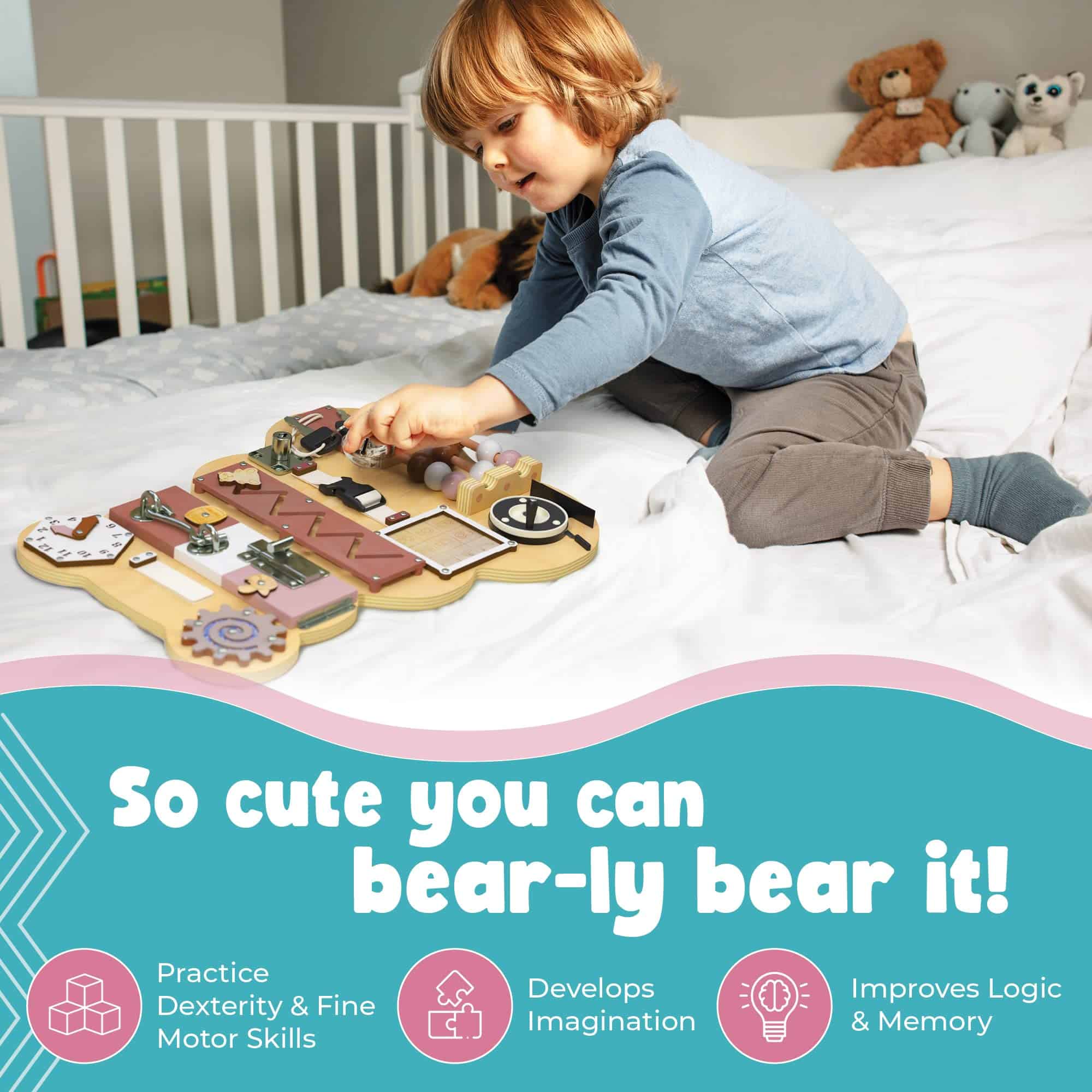 2. DISEÑO ADORABLE CON FORMA DE OSO – ¡Tan lindo que apenas puedes soportarlo! Nuestro tablero sensorial en forma de oso para niños pequeños actúa como un compañero educativo de juego y un divertido compañero de viaje. Ayuda a los niños a desarrollar la lógica, la imaginación, las habilidades motoras finas, la destreza, la memoria y la independencia. Una adición entretenida a cualquier sala de juegos.