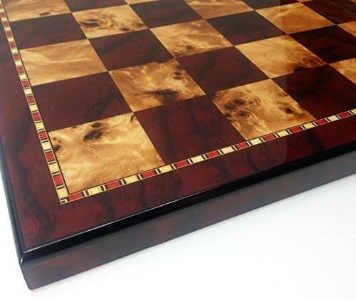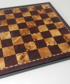 Tablero de ajedrez de alta calidad en color cerezo brillante y madera de raíz de burl. Este tablero cuenta con una base completamente fieltrada para un juego suave y silencioso. Las dimensiones generales son 18″ x 18 x 1″ con una superficie de juego de 15.75″ x 15.75″. Los cuadros de juego son de 1 31/32 pulgadas de tamaño. Fabricado con laminado lacado de alta calidad sobre madera MDF, este tablero es resistente y duradero, ideal para partidas de ajedrez de alto nivel.