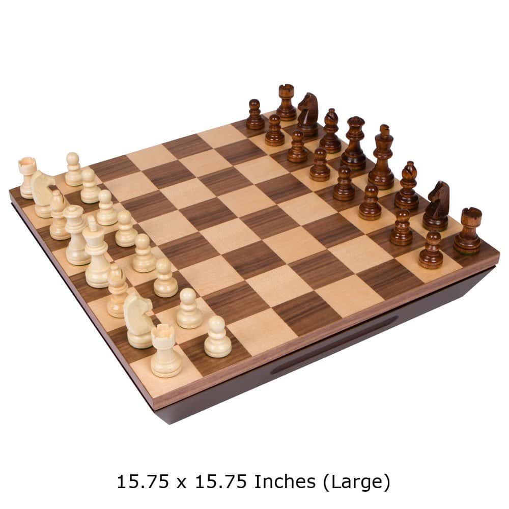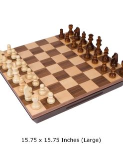 El tablero de ajedrez Aria de 16 pulgadas de Best Chess Set aporta una elegancia discreta a cada partida que juegas con él. Está bellamente elaborado pero no es excesivamente adornado hasta el punto de distraer. Cuenta con cuadros de madera incrustados y cortados con precisión hechos de madera de Arce y Nogal de EE. UU. El tablero es inusual en el sentido de que no tiene borde alrededor de las casillas y tiene una base inclinada, lo que le da un aspecto único. Además, el tablero se levanta para permitir un fácil almacenamiento de las 32 piezas de ajedrez dentro del estuche. Las piezas estándar de ajedrez están hechas de madera marrón oscuro y marrón claro y están ponderadas. Además, están acolchadas en la parte inferior para proteger tu tablero. El rey mide 3 pulgadas de altura con una base de 1.1 pulgadas de diámetro. El peso total de este set con piezas es de robustas 7.1 libras. Asegúrate de medir nuestras dimensiones declaradas para ver si se ajustan a tus necesidades antes de hacer el pedido. Viene en un empaque de venta al por menor. Best Chess Set es una empresa con sede en California y este producto se ensambla en China en nuestra propia fábrica controlada por calidad.