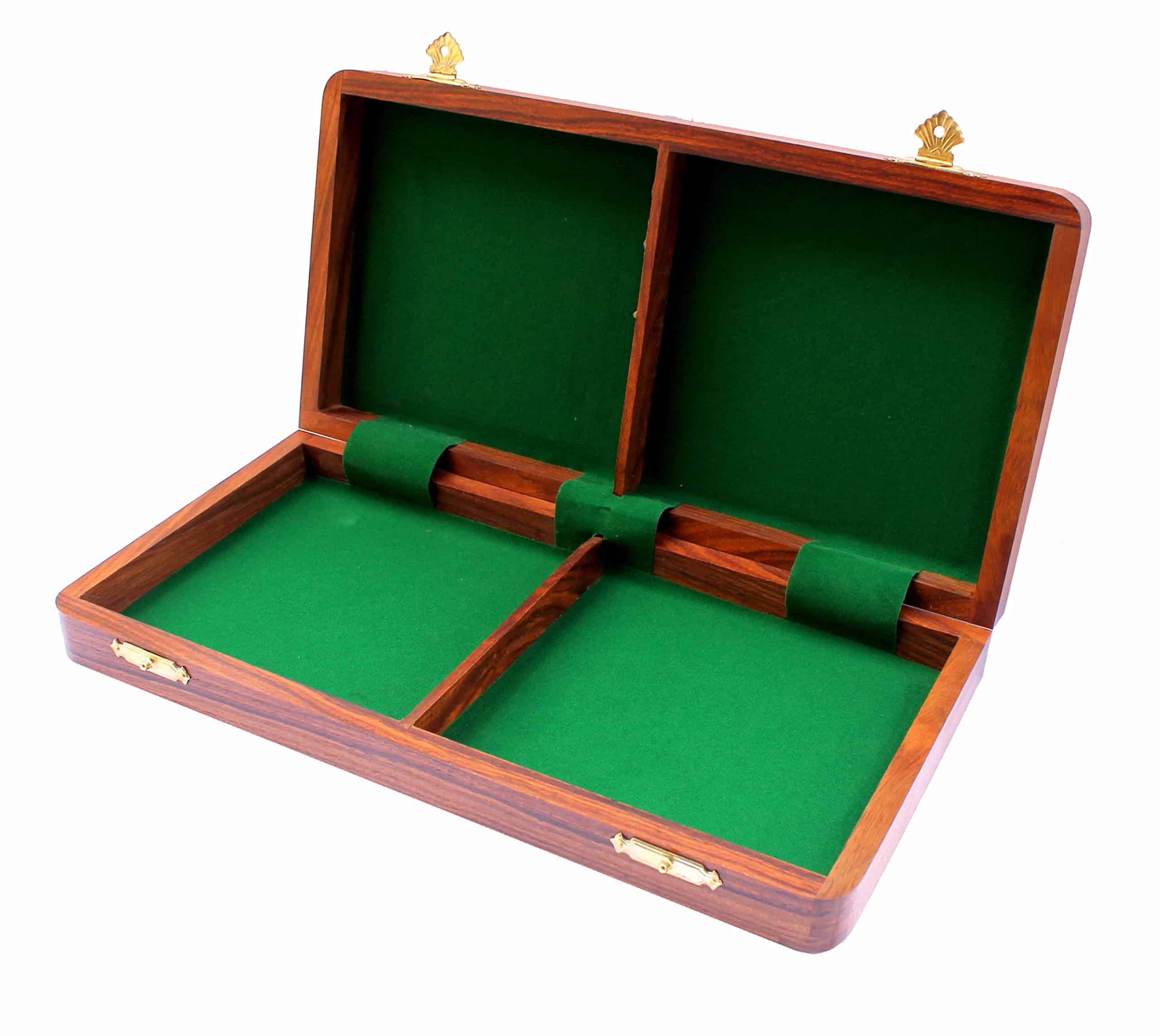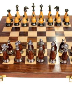 Tablero de ajedrez plegable hecho a mano sobre una base de madera con cuadros de madera incrustados. Las piezas están hechas de latón y madera combinada y han sido talladas individualmente. Estos peones de estilo Staunton también están hechos de madera pulida marrón/amarilla y latón. Tablero de ajedrez bellamente tallado a mano para su sala de estar. Para un tablero cuadrado de 14″ x 14″, el Rey mide casi 3.0″ de alto y el tamaño de las demás piezas es acorde al Rey. Los peones de estilo Staunton son de madera natural de color marrón oscuro y marrón claro. Todas las piezas también están talladas a mano. El juego de ajedrez en sí mismo tiene almacenamiento para todas sus 32 piezas y está forrado con un paño de tacto satinado. Como se puede ver en la imagen, la caja principal es de madera y tiene incrustaciones de madera en la parte superior. La caja de madera también sirve como almacenamiento para mantener las piezas a mano para mayor comodidad.