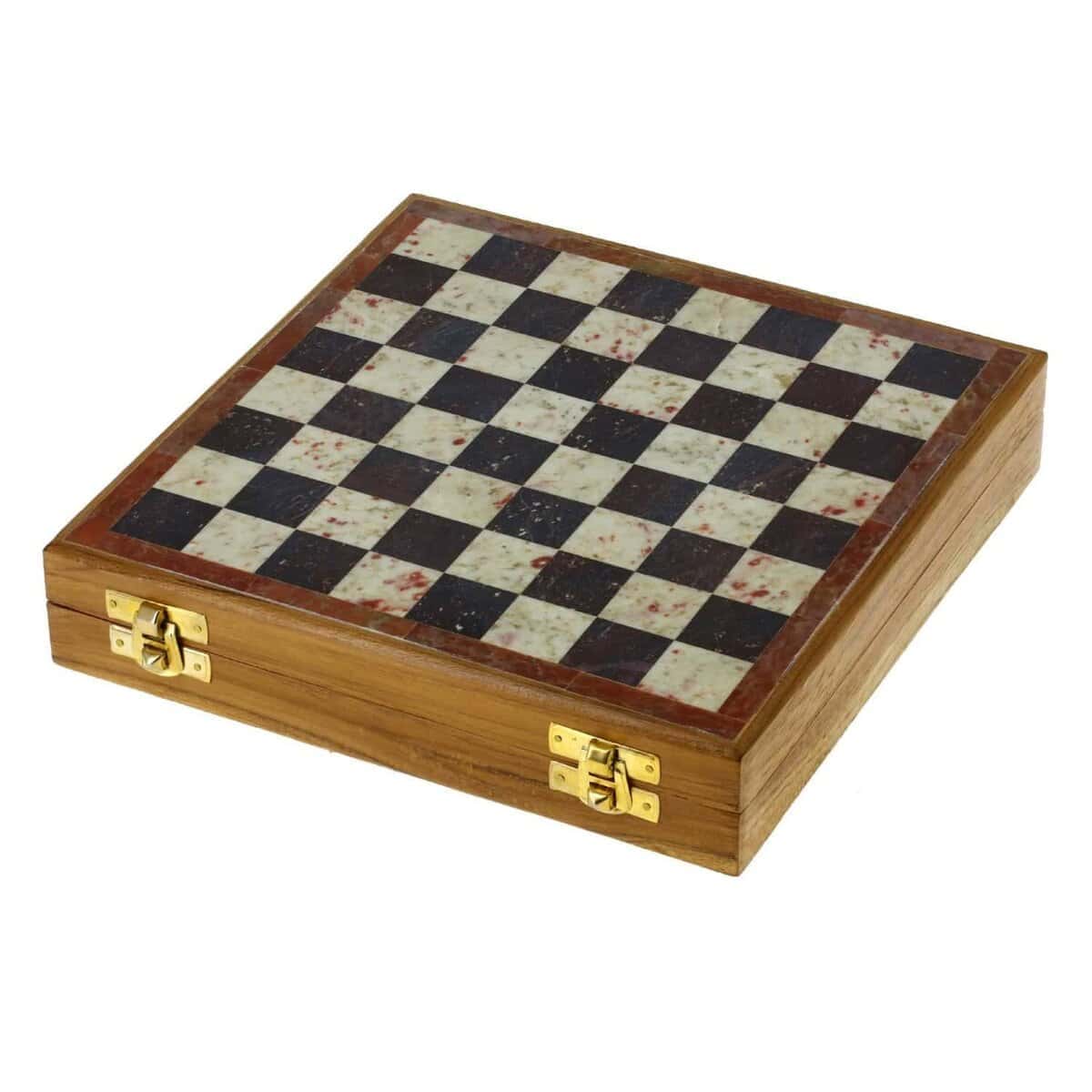 Tablero de ajedrez artesanal hecho en piedra y las piezas también están hechas de piedra marrón/negra. Juego de ajedrez de piedra indio tallado a mano. Tamaño del Rey es casi 1.5″ de alto para el tablero de ajedrez de 8″ x 8″. Tamaño del Rey es casi 2″ de alto para el tablero de ajedrez de 10″ x 10″. Tamaño del Rey es casi 2.5″ de alto para el tablero de ajedrez de 12″ x 12″. Tamaño del Rey es casi 3″ de alto para el tablero de ajedrez de 14″ x 14″. Los colores principales de piedra utilizados en este juego de ajedrez son blanco y gris oscuro. El tablero también está decorado con incrustaciones de madera. Los peones son de piedra natural de color negro y marrón. Todas las piezas están talladas a mano. El juego de ajedrez en sí tiene almacenamiento para sus 32 peones y está recubierto con una tela de suave satín. Como se puede ver en la imagen, la caja principal es de madera y las incrustaciones de piedra se han colocado en la parte superior de la caja de madera. Por favor, tenga en cuenta que la imagen es una imagen de muestra, el mármol es una piedra natural y el producto real podría tener algunas vetas, diferencias de color y/o tono menores en comparación con la imagen. El tamaño del Rey es de 1.5″ de altura. Las otras piezas son proporcionales al Rey.