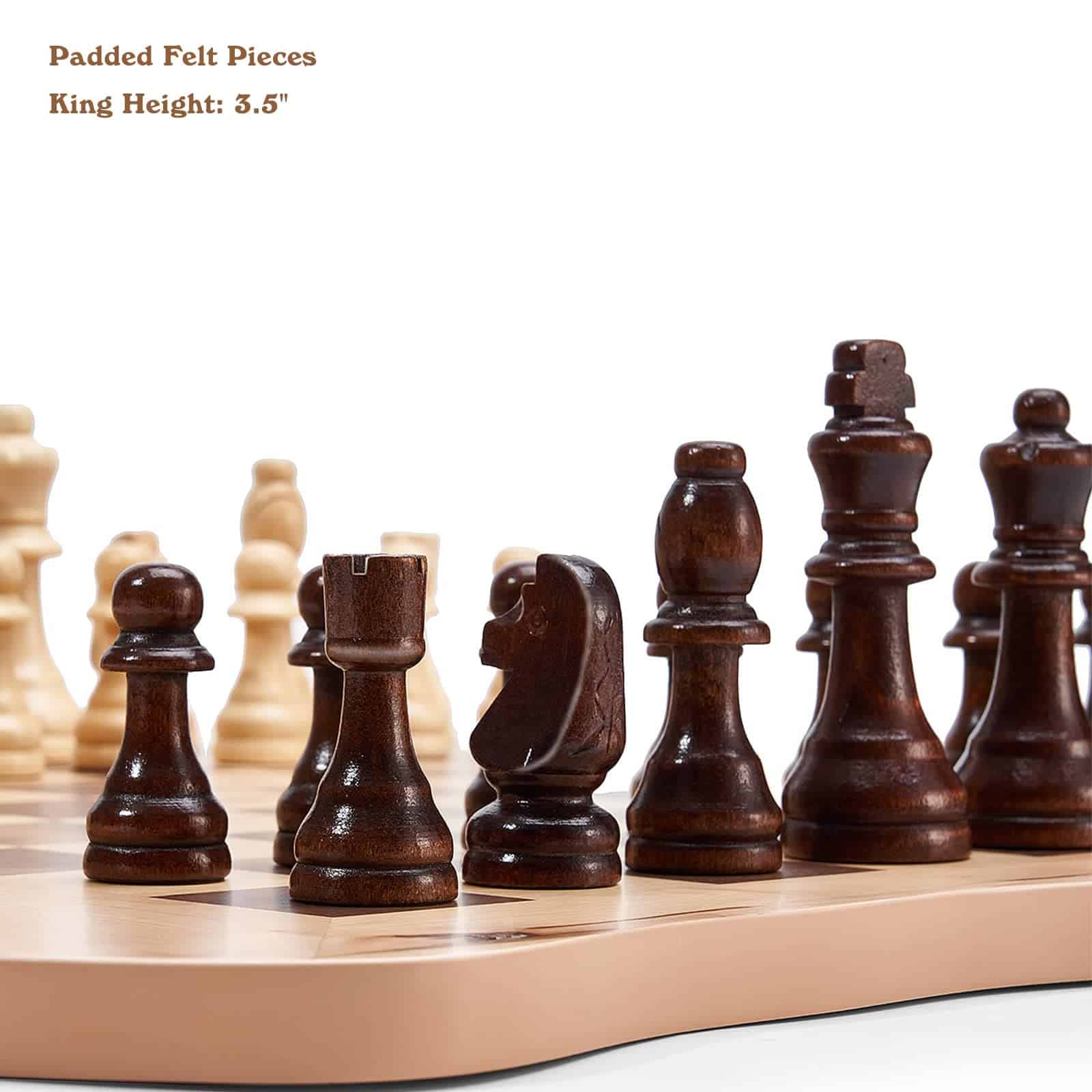 Viene con 32 peones de madera para jugar. También viene con 2 bolsas de terciopelo para almacenar las piezas.