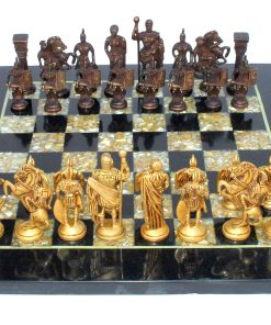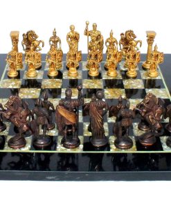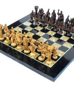 Este único y hermosamente elaborado Tablero de Ajedrez para su sala de estar está creado con pasión y es único, nuestra propia creación. Las Piezas de Ajedrez romanas agregan brillo y gravedad adicionales a este juego de ajedrez. Las piezas están hechas de latón negro y amarillo pintado y han sido talladas individualmente a mano. Este ajedrez está elaborado en piedra de mármol negro de la India con piezas de (MOP) Madre de Perla semi-preciosas llenas de resina epoxi, por favor refiérase a las fotos. Las dimensiones externas del tablero de ajedrez son alrededor de 15″ x 15″ y el rey mide casi 3.5″ de altura. Todas las piezas están hechas a mano y el peso aproximado es de 2.5 kgs. Debido a la naturaleza habitual del producto, es posible que encuentre una vena natural y que el producto real pueda variar en color respecto al que se muestra en la imagen.