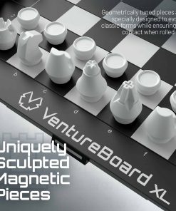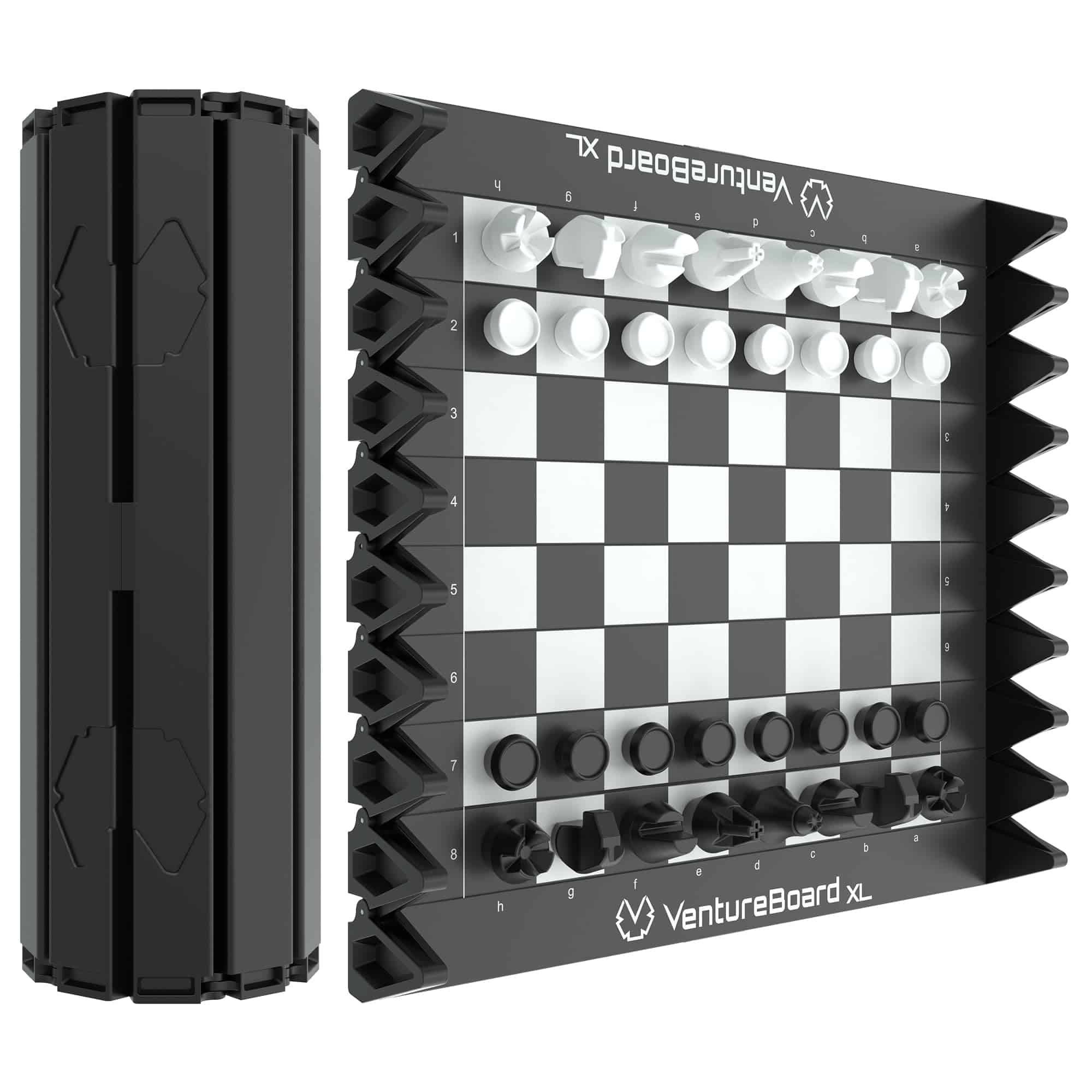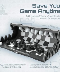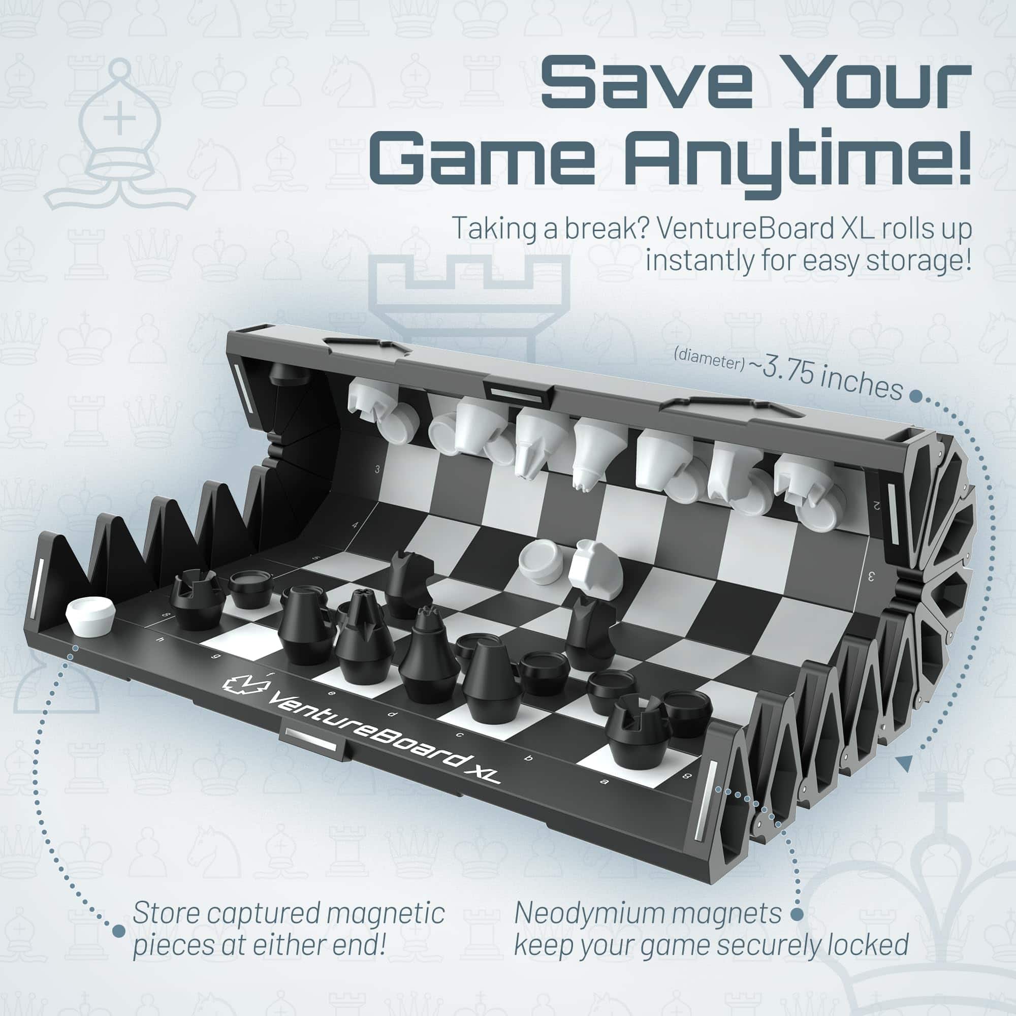 ¡VentureBoard entra en acción para que puedas pasar tiempo jugando y no buscando! Con solo tocarlo, se desenrolla desde un cilindro hexagonal compacto a un tablero de ajedrez listo para jugar. Las piezas se pueden almacenar en sus posiciones iniciales para que no sea necesario tiempo de configuración. Un rápido movimiento de muñeca asegurará tu juego de forma segura en un compartimento sellado magnéticamente. VentureBoard se puede guardar, lanzar o enrollar sin desplazar piezas o perder tu juego. Puedes retomar donde lo dejaste en cualquier lugar que desees.