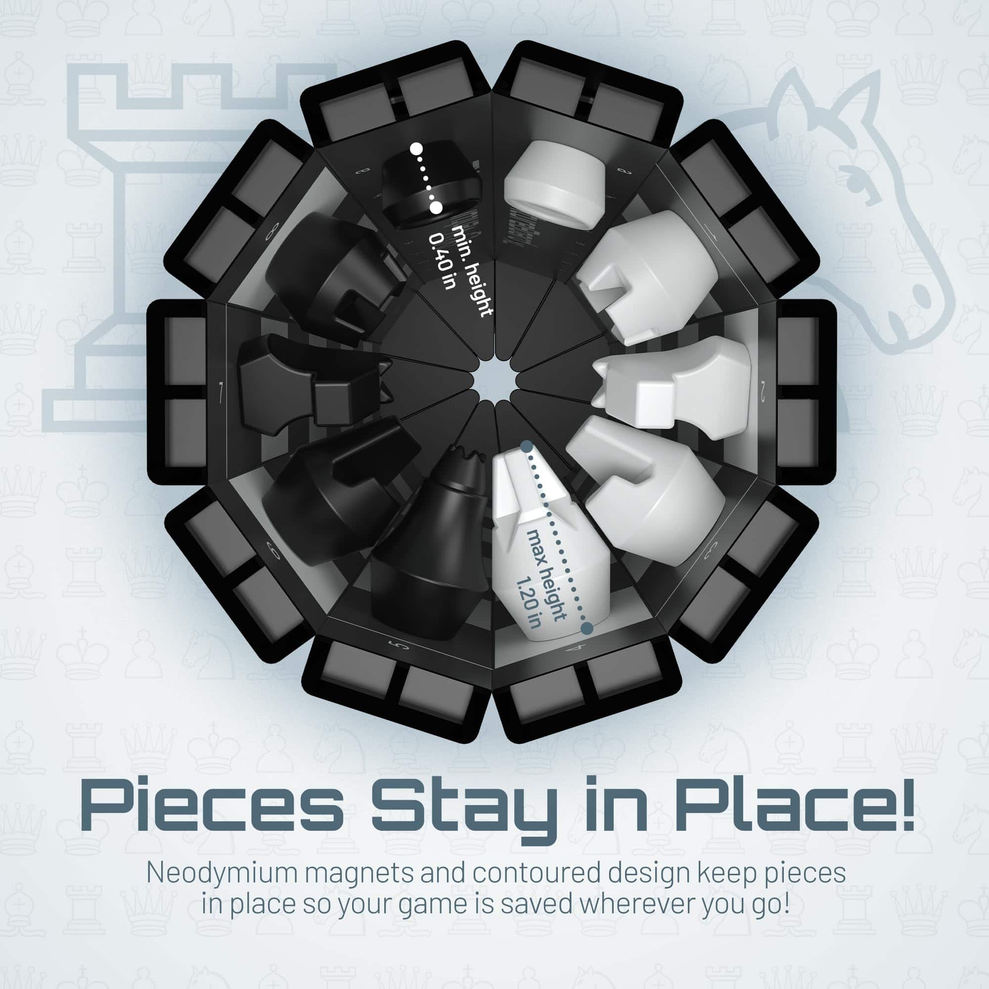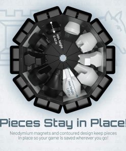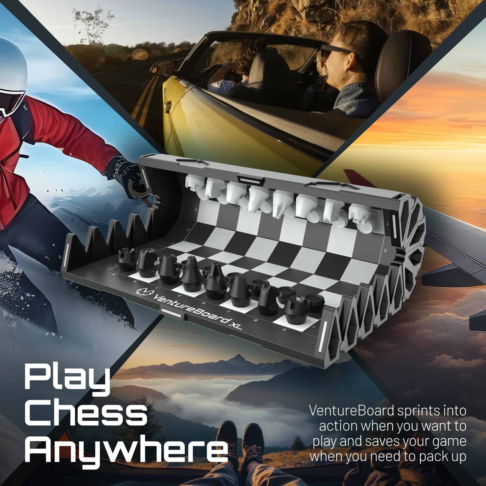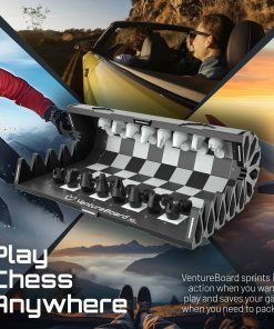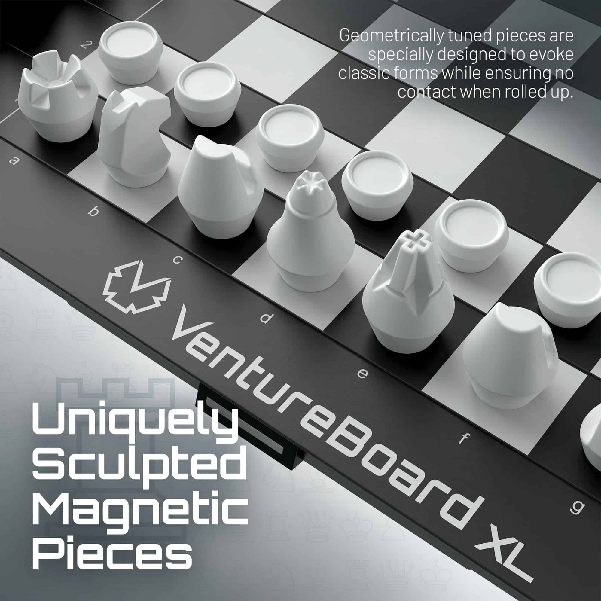 ¡VentureBoard entra en acción para que puedas pasar tiempo jugando y no buscando! Con solo tocarlo, se desenrolla desde un cilindro hexagonal compacto a un tablero de ajedrez listo para jugar. Las piezas se pueden almacenar en sus posiciones iniciales para que no sea necesario tiempo de configuración. Un rápido movimiento de muñeca asegurará tu juego de forma segura en un compartimento sellado magnéticamente. VentureBoard se puede guardar, lanzar o enrollar sin desplazar piezas o perder tu juego. Puedes retomar donde lo dejaste en cualquier lugar que desees.