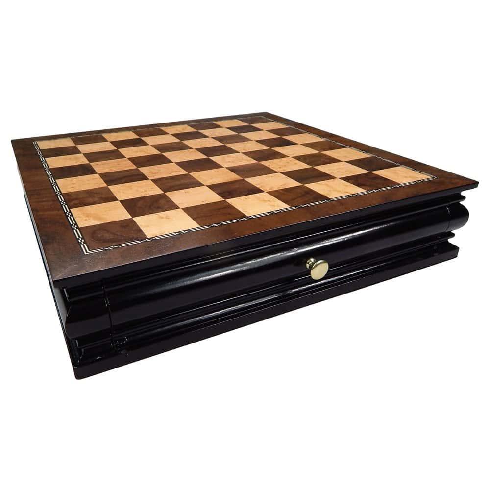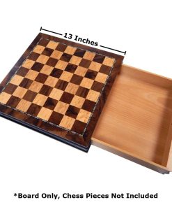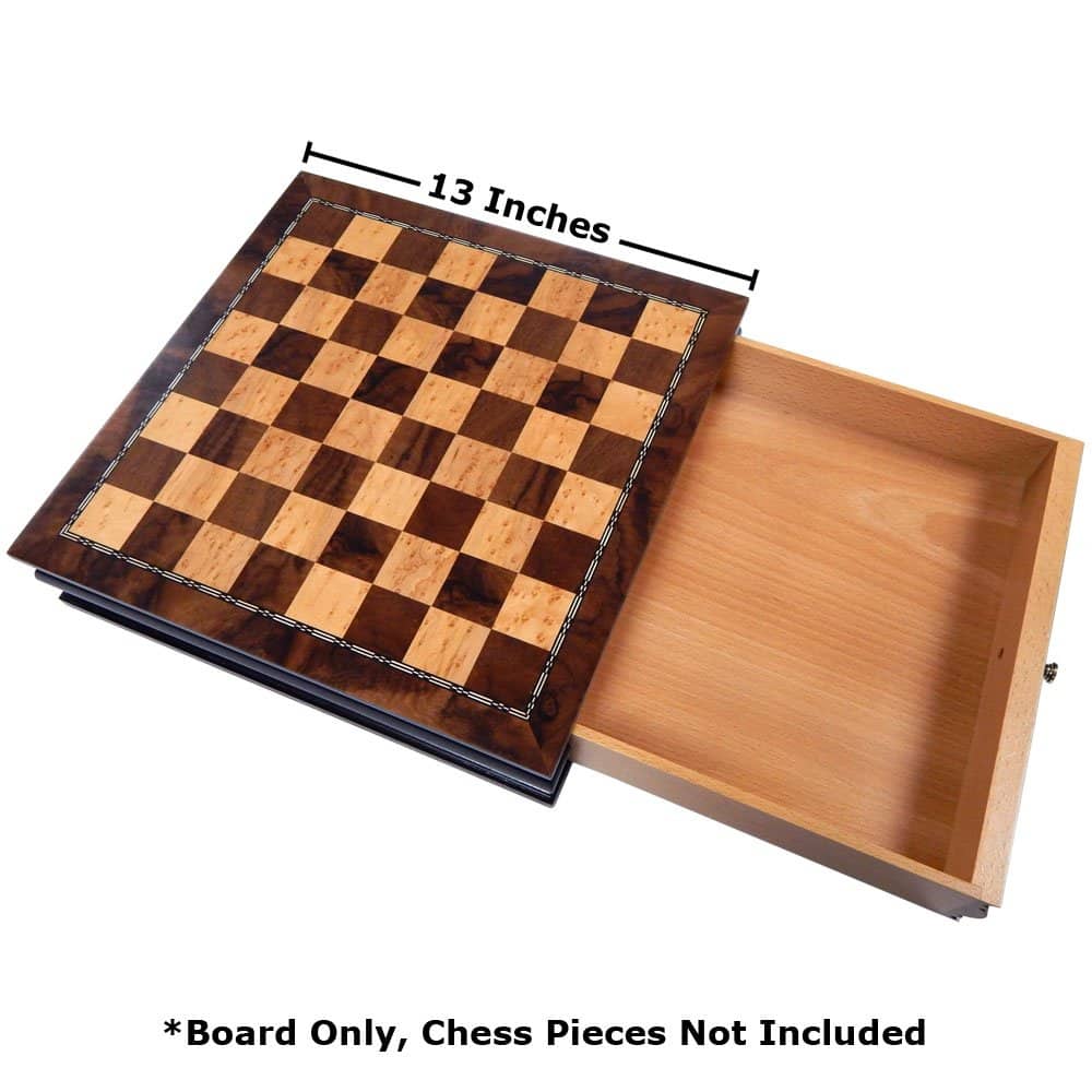 El tablero de ajedrez de madera Vada de 13 pulgadas de Best Chess Set con cajón de almacenamiento aporta una elegancia discreta a cada partida que juegas. Está bellamente hecho pero no es excesivamente recargado hasta el punto de distraer. Cuenta con casillas de madera incrustadas y cortadas con precisión hechas de madera de haya y raíz de burl de Olmo procedentes de Europa y Estados Unidos. El tablero es robusto para su tamaño ya que pesa aproximadamente 4.75 libras. Además, está acolchado con fieltro en la parte inferior para proteger tus muebles. Se vende solo como tablero para que puedas usar tu propio conjunto de piezas favoritas o comprar uno de nuestros sets a juego. Asegúrate de medir nuestras dimensiones indicadas para ver si se ajustan a tus necesidades antes de hacer el pedido. Viene en un empaque al por menor. Best Chess Set es una empresa con sede en California y este producto se ensambla en China en nuestra propia fábrica controlada de calidad.