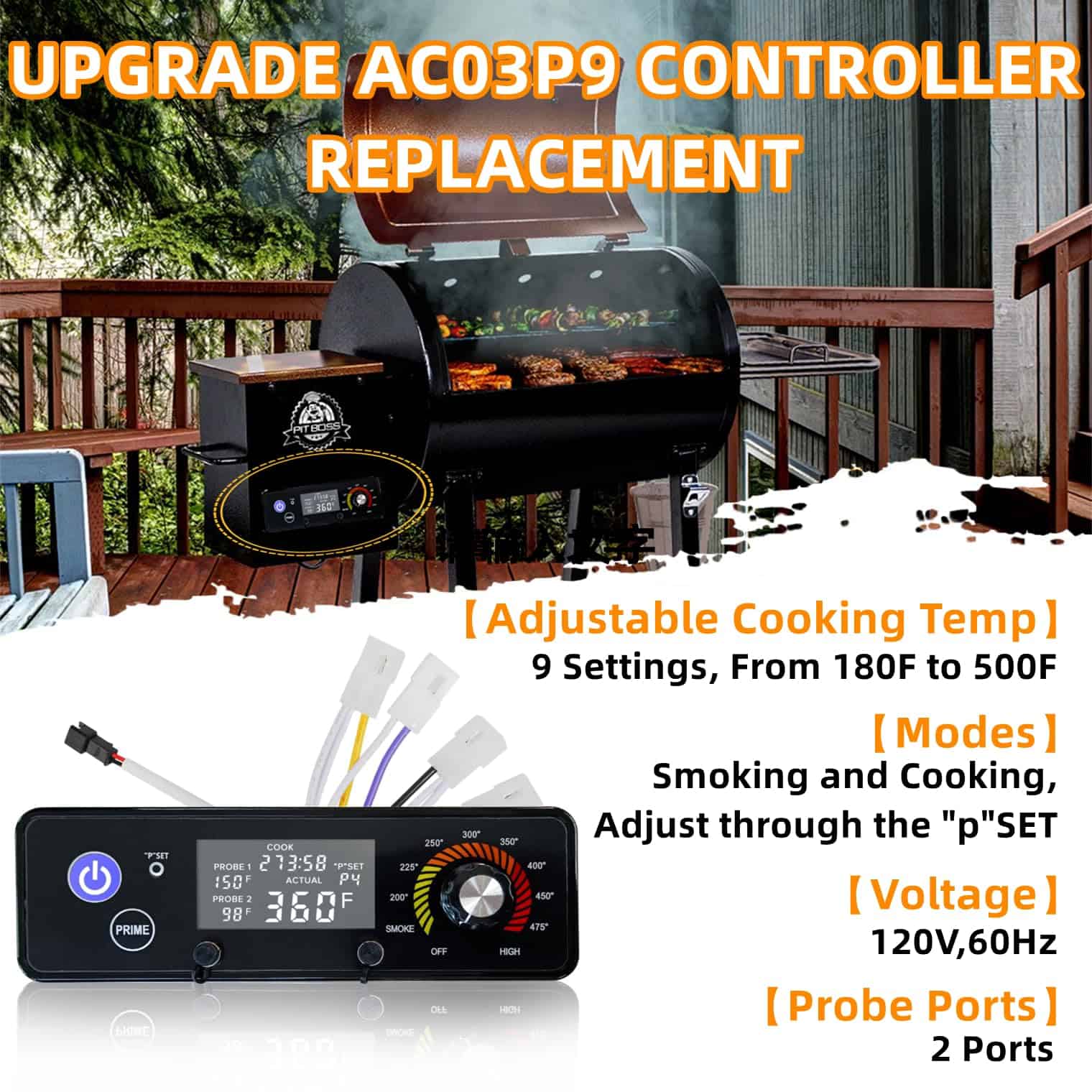 Tablero de control digital actualizado con pantalla LCD AC03P9, PB1100PS1-A003 compatible con parrillas de pellets de madera Pit Boss. Resuelva problemas de control de temperatura perdido con el original. Incluye 9 ajustes de temperatura de cocción, con posibilidad de ajuste fino. Evita daños al controlador por cortocircuitos. Fácil instalación, simplemente conecte los cables de colores correspondientes. Garantía de satisfacción del 100%.
