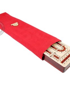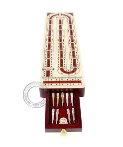 El tablero de cribbage hecho a mano ha sido incrustado en madera de arce y pau rosa. Las pistas grabadas son de pau rosa y arce. El pau rosa es una madera de color rojo oscuro natural y la madera de arce siempre es de color blanco natural.