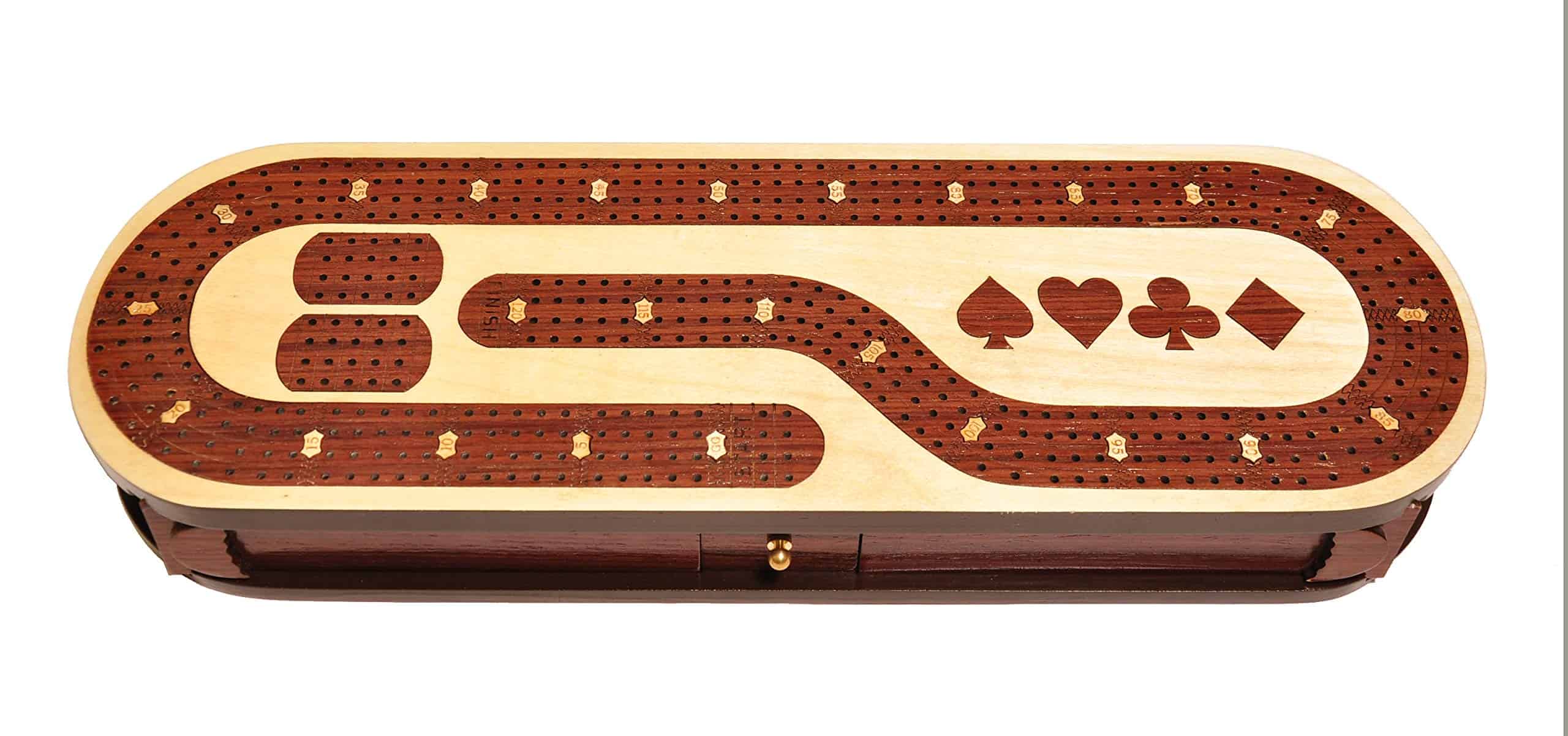 Palm Royal Handicrafts presenta un tablero de Cribbage continuo de 4 pistas (120 casas) para hasta 4 jugadores. Este tablero de Cribbage presenta una variación entre las pistas de madera de rosa y de arce, con agujeros muy finos para las clavijas. En ambos lados del tablero hay una forma semicircular que facilita su manejo. El almacenamiento está disponible para guardar las cartas de juego en ambos lados del tablero, además de contar con cerraduras magnéticas en los deslizadores en ambos lados del juego. El tablero de Cribbage hecho a mano ha sido incrustado en madera de rosa y de arce. Incluye 3 clavijas doradas, 3 negras, 3 de bronce y 3 plateadas. Espacios para guardar las clavijas. Tablero de cribbage de 4 pistas, cribbage continuo de 4 pistas, tablero de cribbage 2D.