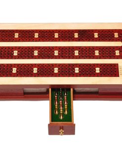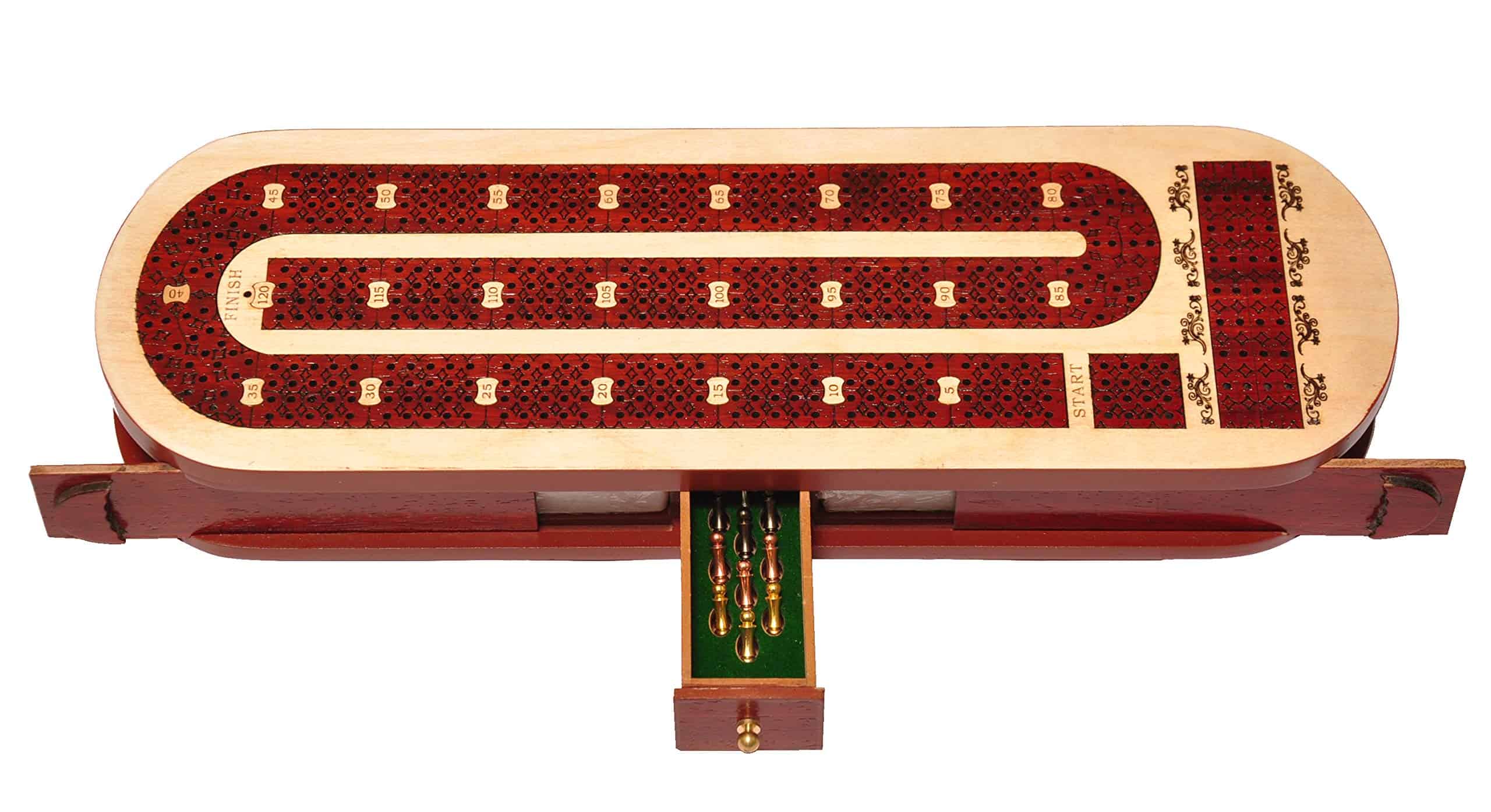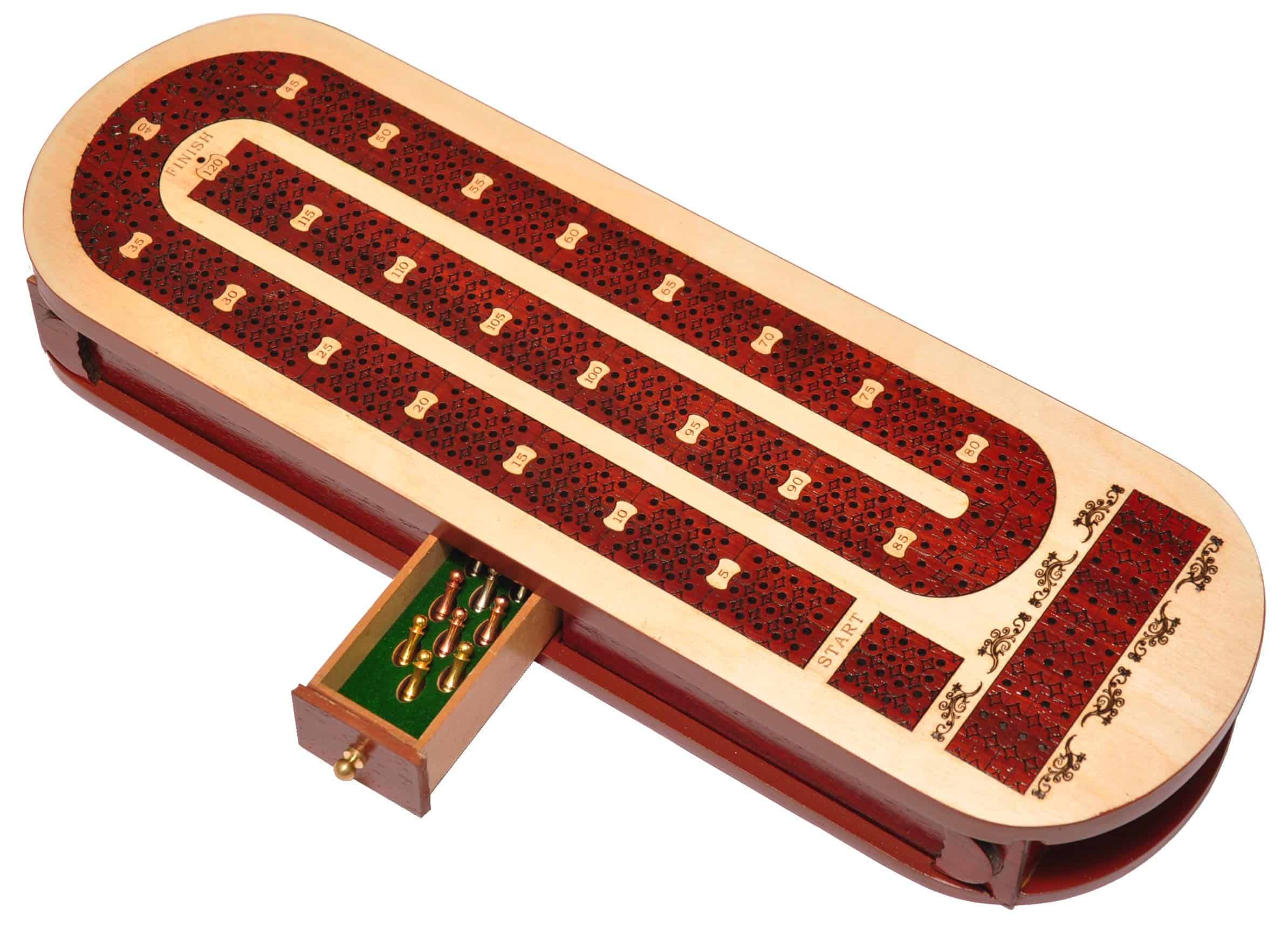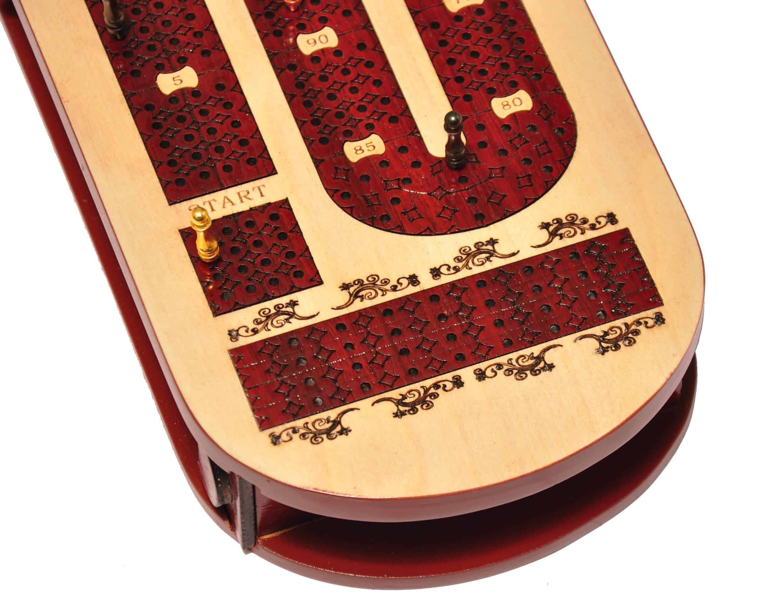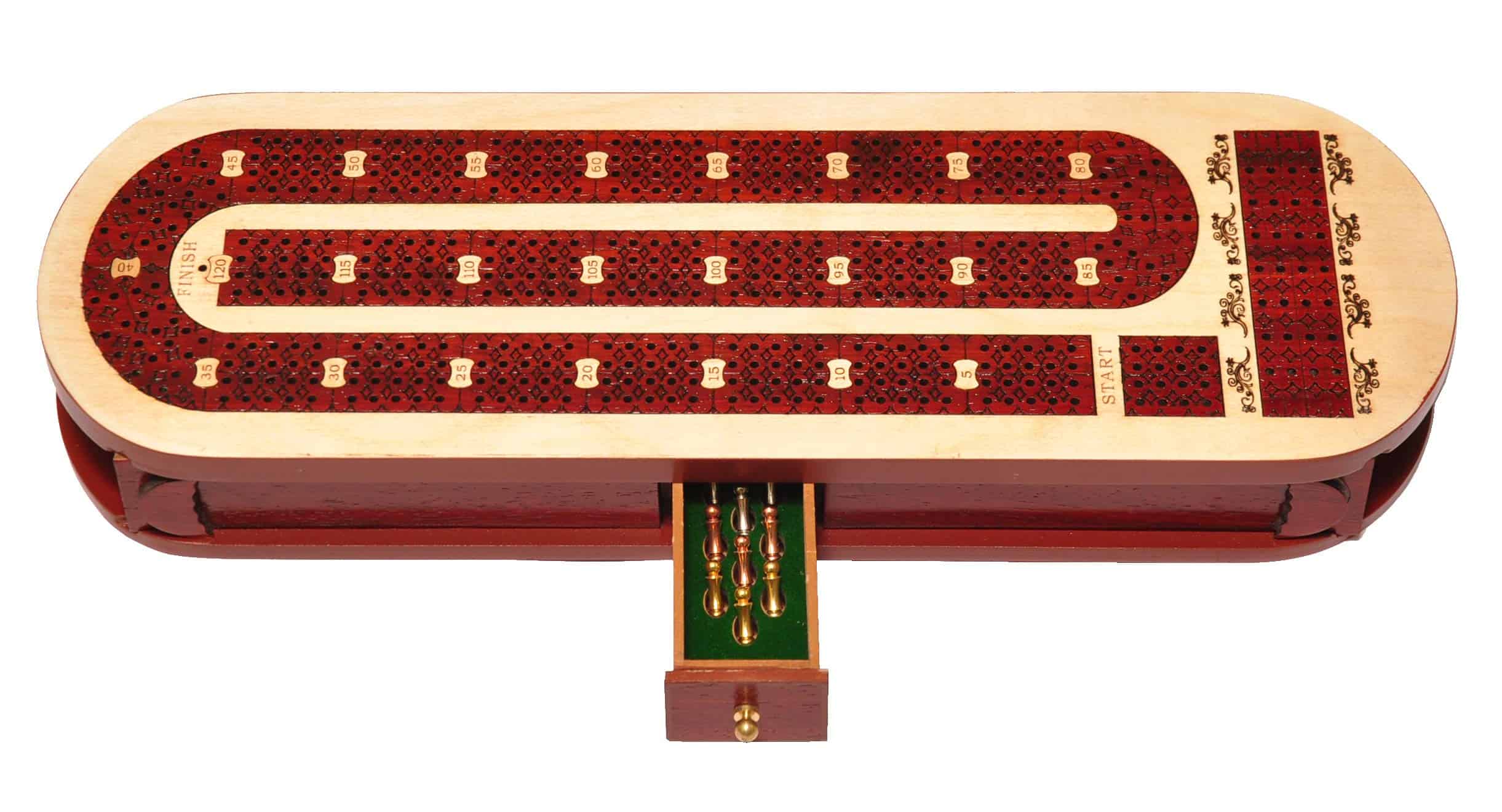 El tablero de cribbage hecho a mano ha sido incrustado en madera de Blood Wood y Maple Wood.
