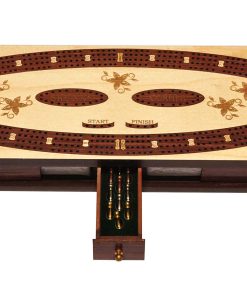 Palm Royal Handicrafts presenta un tablero continuo de cribbage de 4 pistas (120 casas). Está diseñado para hasta 4 jugadores. Este es un tablero de cribbage en el que se puede apreciar la variación entre las pistas de madera de rosa y arce, y tiene agujeros muy finos para las clavijas. Además, en ambos lados del tablero hay una forma semicircular que facilita su manejo. El almacenamiento está disponible para guardar las cartas de juego en ambos lados del tablero de cribbage, además de esto, hay cerraduras magnéticas en los deslizadores en ambos lados del juego. El tablero de cribbage hecho a mano ha sido incrustado en madera de rosa y arce. Tipo de Clavijas: 3 doradas, 3 negras, 3 bronce y 3 plateadas clavijas. Orificios para almacenar clavijas. Tablero de cribbage de 4 pistas. Cribbage continuo de 4 pistas. Tablero de cribbage de madera.
