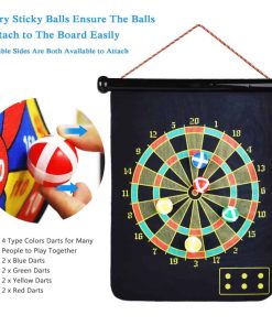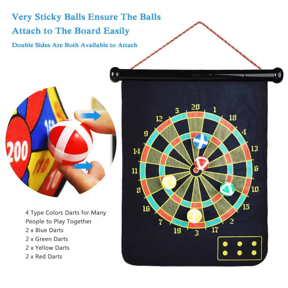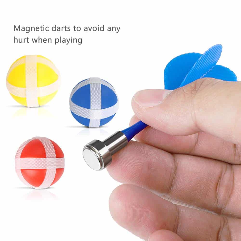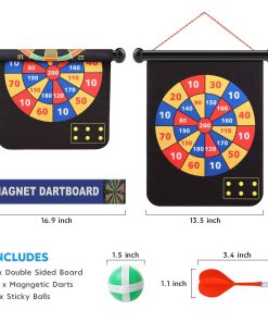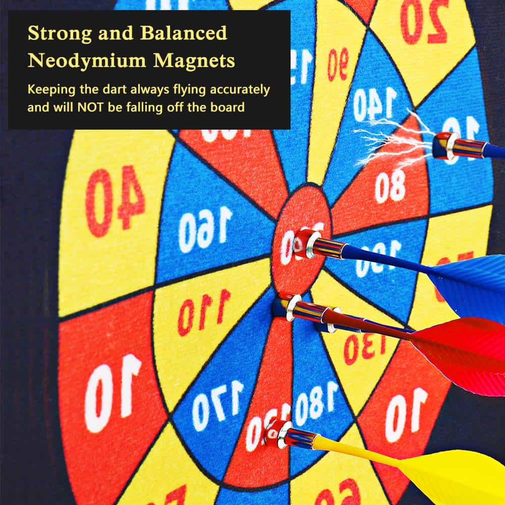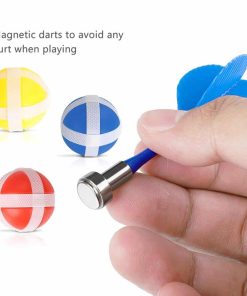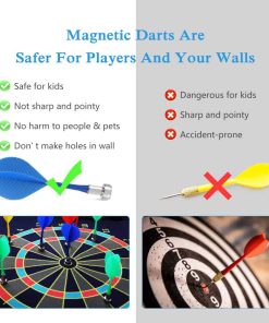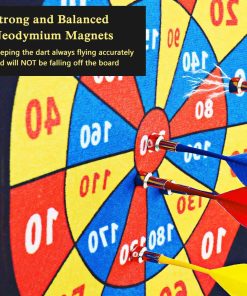 Tablero de dardos magnético para niños y adultos que incluye 12 dardos magnéticos y 8 bolas adhesivas. Este juego de tablero de dardos seguro y sin agujeros en la pared es ideal para niños y niñas. El juego incluye dardos magnéticos y bolas muy pegajosas en 4 colores diferentes, para que muchas personas puedan jugar. Las bolas pegajosas y los imanes de neodimio equilibrados mantienen el dardo volando con precisión para un rendimiento óptimo. Los dardos magnéticos no son afilados ni puntiagudos como los tradicionales, lo que los hace seguros para niños y mascotas. Además, evitan que la pared se llene de agujeros, por lo que no hay necesidad de preocuparse por dañar las paredes. Este juego clásico es ideal para desarrollar la coordinación mano-ojo de los niños, practicar el conteo y la suma. Es una excelente opción para regalos de cumpleaños o Navidad para la familia y amigos. También es un juego perfecto para jugar en interiores y exteriores, en el patio trasero, en fiestas de cumpleaños, en bares, en la oficina o incluso en tus vacaciones favoritas. El tablero es reversible, con un lado estándar de diana y un lado de puntuación. Este juego de dardos para niños también fomenta la práctica de contar y sumar como beneficio adicional. Incluye ayuda postventa de por vida, 12 dardos magnéticos, 8 bolas adhesivas y un tablero de dardos magnéticos reversible fácil de almacenar y transportar. Confiamos en la calidad de nuestro juego de dardos magnético y ofrecemos ayuda al cliente de por vida. Si no estás satisfecho de alguna manera, no dudes en contactarnos. ¡Te brindaremos una maravillosa asistencia en el momento! Creemos que te encantará nuestro producto y nuestro servicio al cliente 🙂