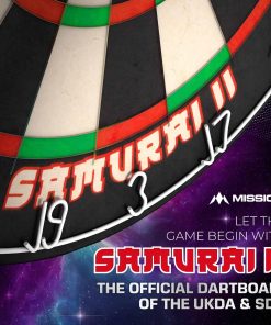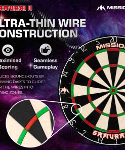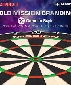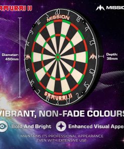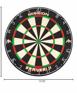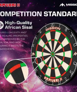 El Mission Samurai II es un tablero de dardos de alta calidad estándar de competencia con construcción de alambre ultra delgado. El ángulo agudo de los alambres permite que los dardos pasen por encima de ellos y entren en las áreas de puntuación, lo que resulta en menos rebotes y daños a los dardos. El tablero de dardos Mission Samurai, fabricado con sisal africano de alta calidad. El tablero presenta una construcción sin grapas y colores vibrantes que no se desvanecen. Especificaciones del Tablero de Dardos | Material: Sisal Africano | Diámetro: 450mm | Profundidad: 38mm