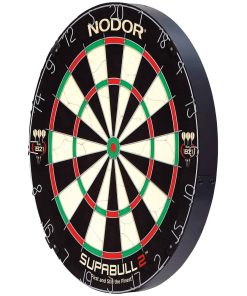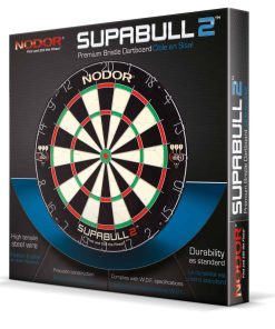 «El Nodor Supabull 2 representa el pináculo de la tecnología de tablero de dardos con cable redondo. Cumple con la W.D.F.». Set contiene: Tablero de dardos de cerdas duradero, accesorios.