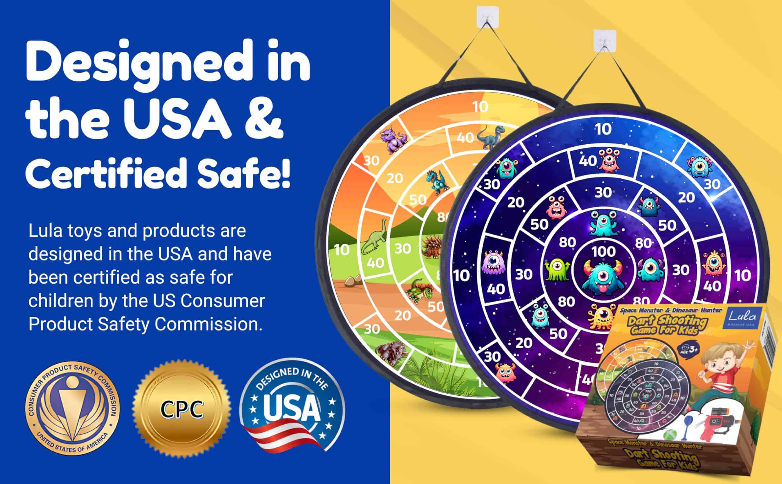 5. DISEÑADO EN EE. UU.: El tablero de dardos para niños de Lula Brands está diseñado aquí en los EE. UU. pensando en ti y tu familia. Certificado Seguro: Inspeccionado y certificado como seguro para niños por la Comisión de Protección al Consumidor de EE. UU.