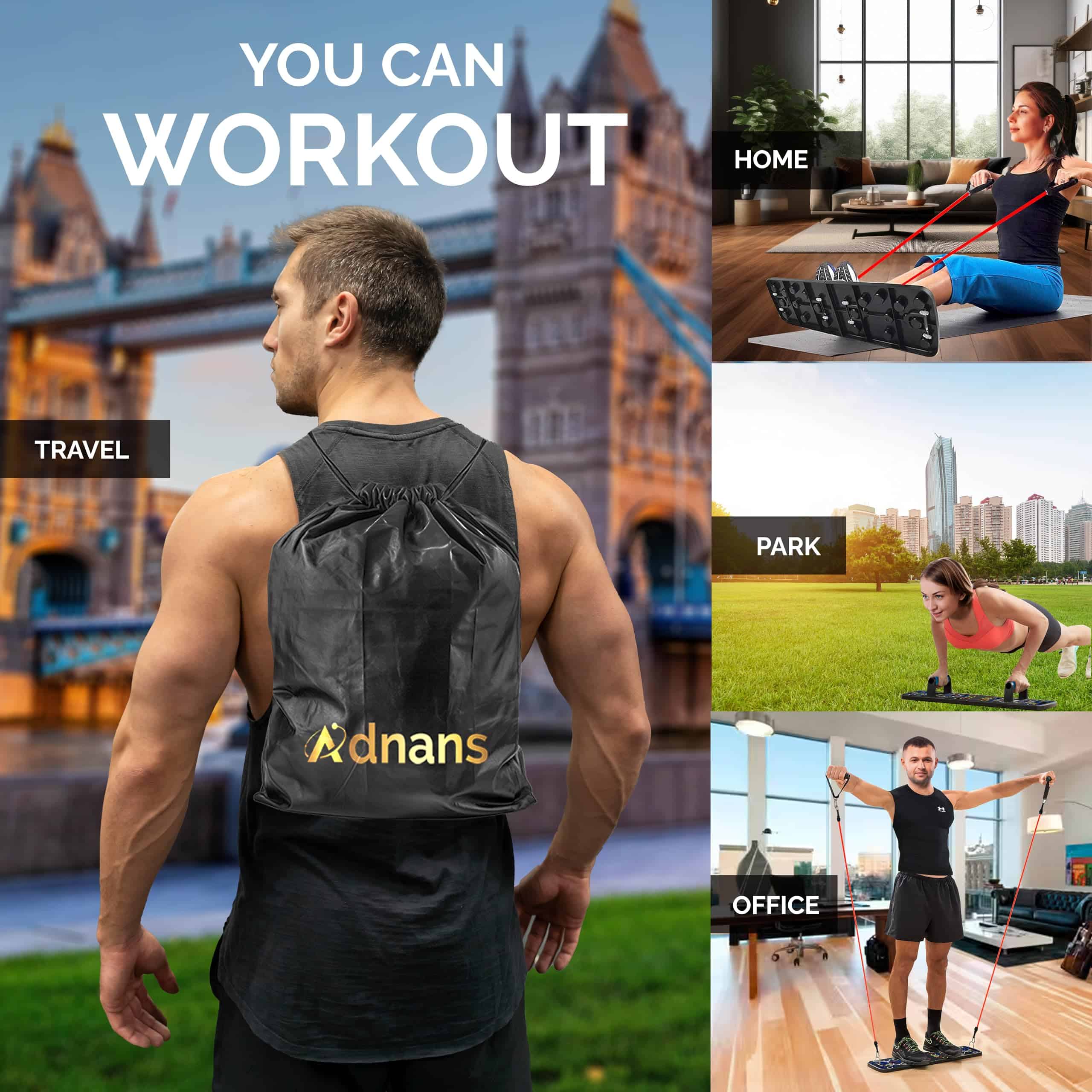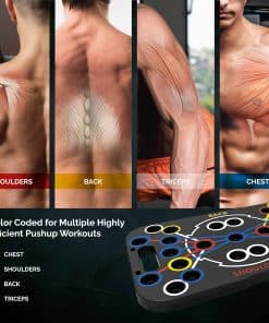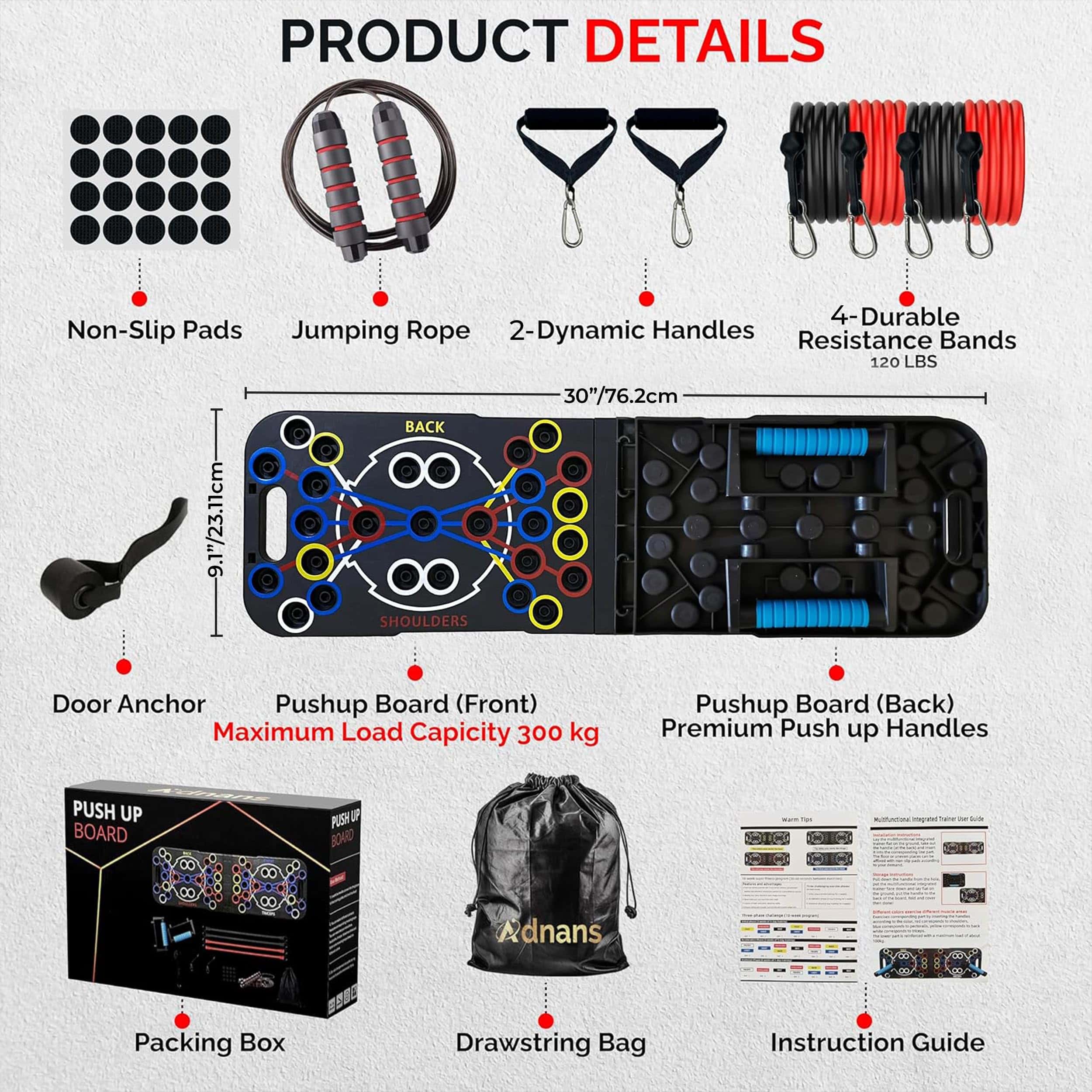 MULTIFUNCIONAL – Nuestro equipo de calistenia es una combinación de tabla de flexiones con bandas de resistencia para entrenar, cuerda para saltar para hombres y mujeres, anclaje de puerta para bandas de resistencia, almohadillas antideslizantes y bolsa con cordón que puede satisfacer la mayoría de sus necesidades de entrenamiento en el gimnasio. Eleve su entrenamiento de fuerza en la comodidad de su hogar. RESULTADO MÁXIMO – El gimnasio portátil de color codificado de Adnan para flexiones perfectas apunta a diferentes grupos musculares (pecho, hombros, tríceps, bíceps y espalda), involucrando su núcleo. Científicamente probado para un 30% a 50% más de activación muscular. Las barras de flexiones incluyen instrucciones detalladas y guía de entrenamiento profesional para un entrenamiento de cuerpo completo. CALIDAD PREMIUM – Nuestro tablero de flexiones mejorado para hombres y mujeres está hecho de plástico ABS Ductile duradero para resistencia y alta resistencia al impacto y a la temperatura. Las manijas de flexiones incorporadas facilitan el transporte, proporcionando un agarre firme y una distribución de presión uniforme. Las almohadillas antideslizantes garantizan estabilidad durante los entrenamientos. SISTEMA DE GIMNASIO EN CASA PARA CUALQUIERA – Nuestro tablero portátil de flexiones diseñado para llevar, almacenar y usar de forma conveniente. Versátil para todos los grupos de edad, desde principiantes hasta profesionales, fortalece los músculos, corrige la postura, tonifica el cuerpo, un ideal soporte de flexiones para entrenamiento de fuerza. Ligero pero estable, ideal para entrenamientos sobre la marcha. NUESTRA PROMESA – Proporcionar productos excelentes y la satisfacción del cliente son nuestras principales prioridades, si nuestro equipo de entrenamiento en casa para hombres y mujeres no cumple con sus expectativas de ninguna manera, por favor contáctenos y le daremos una solución satisfactoria en 24 horas.