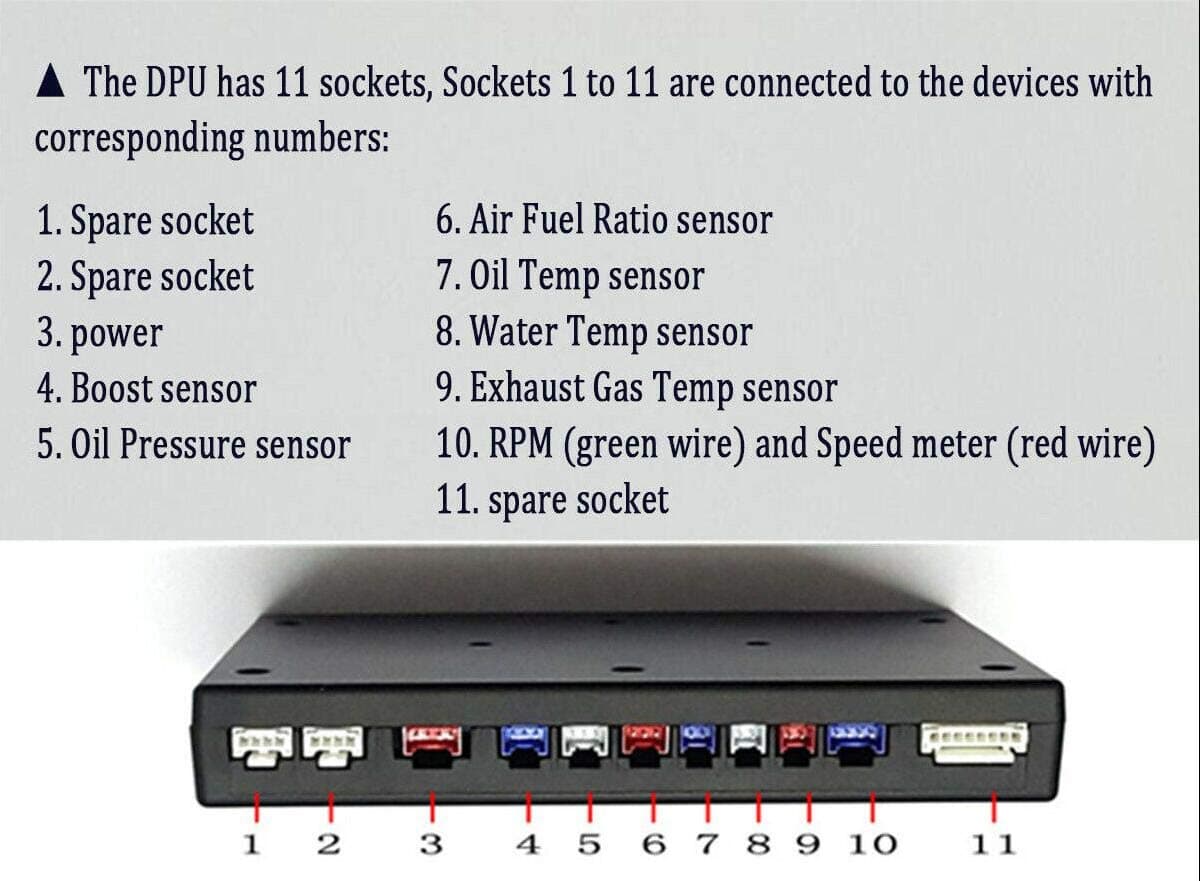 Especificaciones: Modelo: DO908 Tipo de pantalla: número Voltaje: 10V-16VDC (12V dedicado para coche) Conexión: Conexión de arnés (más estable) Velocidad: 0-255Km / h Velocidad del motor de rotación: 0 ~ 9000rpm Presión de aceite (OIL P.): 0 ~ 150PSI o 0 ~ 10BAR Turbo (BOOST.P): -15 ~ 45PSI o -1 ~ 3BAR Relación de aire y aceite: 20 ~ 10: 1 Temperatura del aceite (OIL T.): 0 ~ 150 o 0 ~ 300 Temperatura del agua (WATER T.): 0 ~ 150 o 0 ~ 300 Temperatura de salida (EXT T.): 0 ~ 1,300 o 0 ~ 2400 Reloj: Reloj de 24h Pulso de velocidad correspondiente: 2/4/6/8 pulsos Pulso: 1,274 ~ 16,562 / km (equivale a pulso2 ~ 26) Número de cilindros correspondientes: 1/2/3/4/5/6/8 (en circulación) Tamaño: 18.6 cm 10.2 cm 2.2 cm Incluido en el paquete: 1 x Tablero de coche 1 x Cable de alimentación 1 x Soporte de instalación 1 x Kits de sensores 1 x Manual de usuario