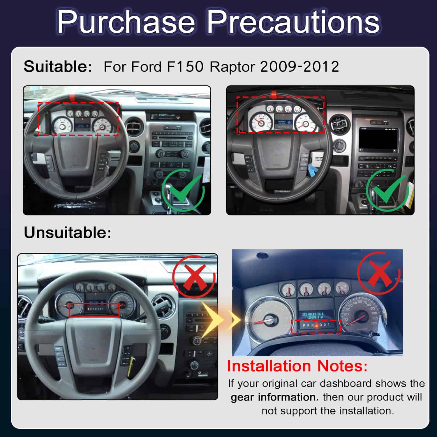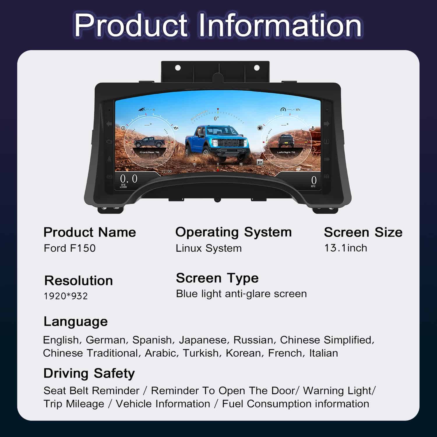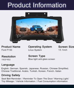 Este tablero de instrumentos digital mejora la tecnología en tu Ford F150 2009-2012. Con pantalla LCD de 13.1 pulgadas, resolución de 1920×932 y compatibilidad con 12 idiomas, este tablero garantiza una visualización nítida y detallada. Opera con 9V-16V y consume 0.8A-1.5A, minimizando la carga en el sistema eléctrico del vehículo. Contáctanos para soporte técnico y servicio al cliente de alta calidad.