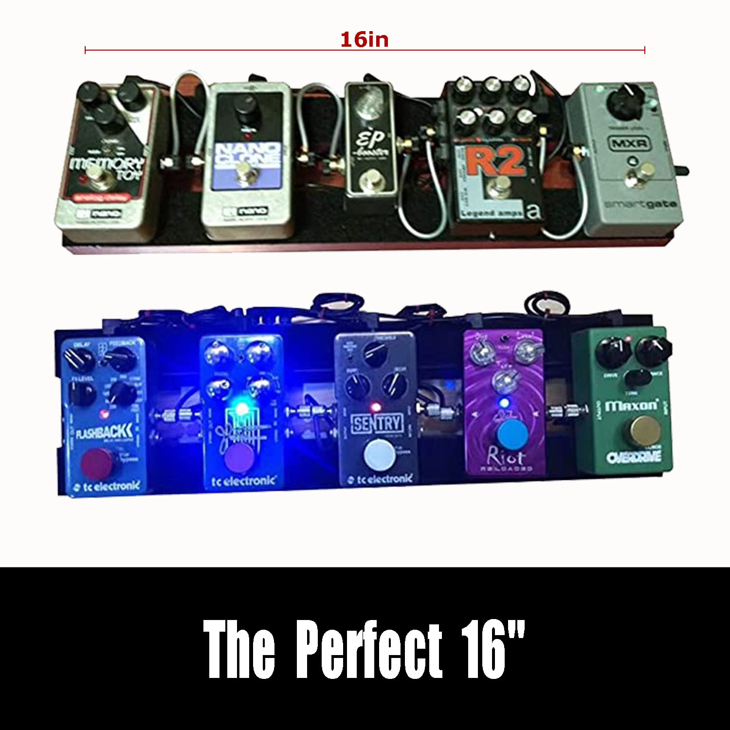 4. Ordenado y Limpio – Puede conectar cables de manera ordenada y segura por encima o por debajo. Fácil de agregar, quitar, reorganizar o pasar por alto pedales. Hay espacio para pasar cables y organizar tus pedales como desees