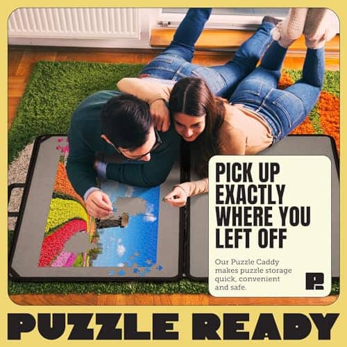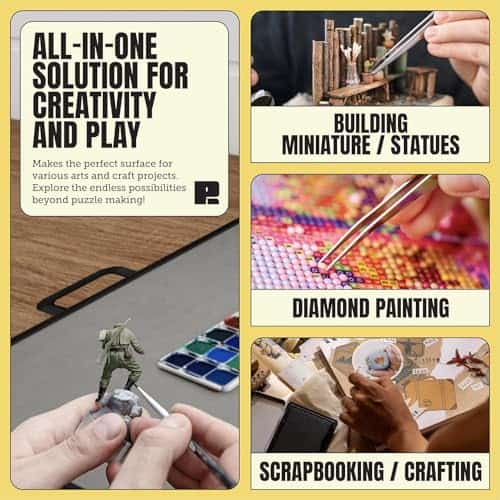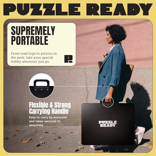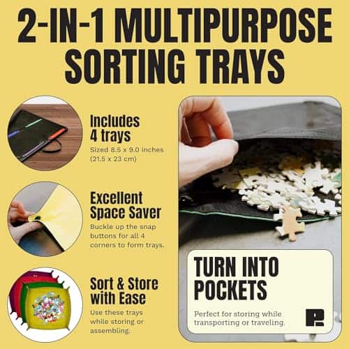 3. Diseñado para amantes de los rompecabezas: Nuestro Tablero de Caddy de Rompecabezas es una solución todo en uno. La cremallera de alta calidad garantiza un sistema de cierre resistente, Piel Vegana Superior para look elegante y duradero, Material Impermeable para la seguridad de tu obra maestra, Superficie de microgamuza antideslizante y asa resistente para moverse fácilmente. Además, (4) Bandejas de Clasificación de Rompecabezas Coloridas para ordenar y sostener las piezas de tu rompecabezas.