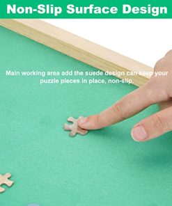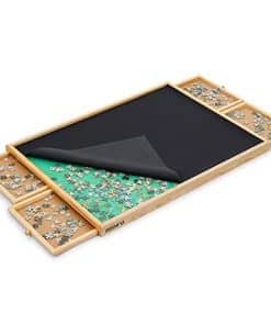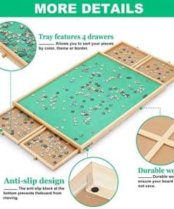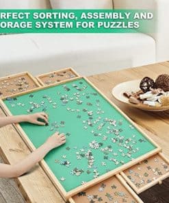 Tablero de rompecabezas de madera grande con 4 cajones deslizantes magnéticos extraíbles. La mesa de rompecabezas de madera consiste en un panel de trabajo central y 4 cajones para almacenar los rompecabezas. La dimensión del panel de trabajo es de 35 x 26 pulgadas, el tamaño de los cajones deslizantes extraíbles es de 12.2 x 17 pulgadas, se adapta a la mayoría de los rompecabezas de 1500 piezas. Nuestro tablero de almacenamiento de rompecabezas tiene cuatro cajones de madera deslizantes, el espacio de trabajo central puede colocar el cuerpo principal del rompecabezas. Los cuatro cajones te permiten ordenar las piezas por color, tema o borde. El cajón cerrado con hebilla puede almacenar el rompecabezas perfectamente, y el rompecabezas no se desplaza al tirar de él. Diseñado para amantes de los rompecabezas y ¡rompecabezas gratis! Nuestro tablero de rompecabezas de madera está diseñado para organizar tus rompecabezas. Fomenta la interacción de calidad. Puede regalarse a la persona más importante en cualquier festival. Alfombra de puzzle gratis para mantener los rompecabezas no completados seguros de los cachorros y gatitos. ¡Nuestra promesa! Dado que la satisfacción del cliente es nuestra principal prioridad, queremos asegurarnos de que estés completamente satisfecho con nuestro tablero de rompecabezas de madera que has comprado. Ofrecemos un reembolso del 100% si nuestro producto no cumple tus expectativas.