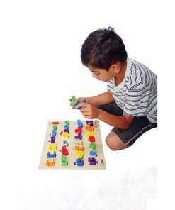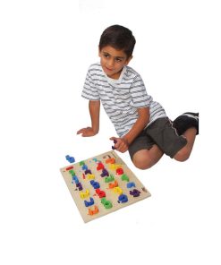 Tablero de madera (tamaño: 11.8″ x 15.7″) con 28 letras árabes. Cada letra de 2 cm de grosor tiene los puntos impresos en el tablero mismo. Los niños podrán tocar, sentir e identificar cada letra.