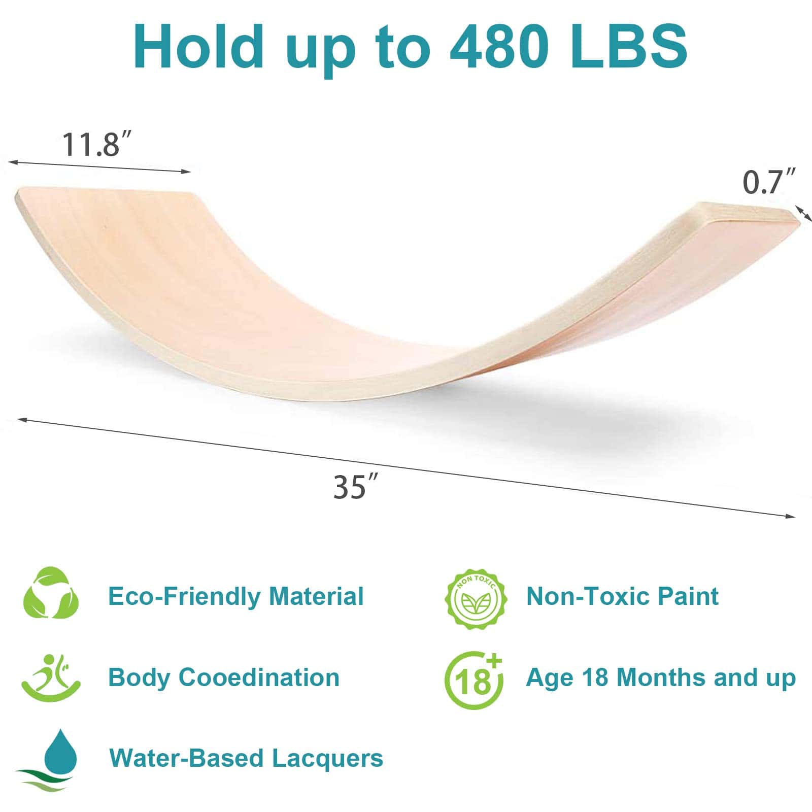 5. Tamaño y Peso Mide 35 pulgadas de largo, 11.8 pulgadas de ancho, 0.66 pulgadas de grosor y 6 pulgadas de altura en el punto más alto. Esta pieza duradera de mobiliario Montessori es un artículo sólido de herencia que se puede utilizar durante muchos años de aventura. Puede soportar de forma segura hasta 480 libras para que los amigos también puedan unirse a la diversión.