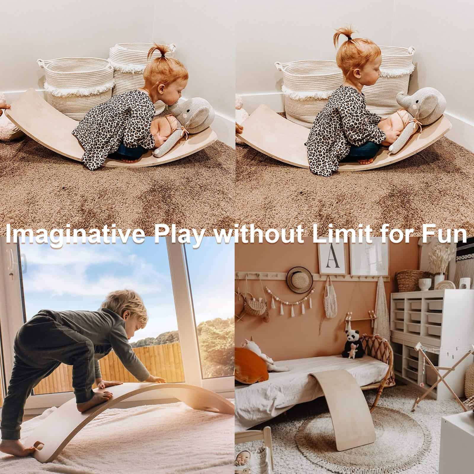 1. Formas ilimitadas de jugar Como un juguete de aprendizaje abierto de lujo, el Tablero de Tambaleo de Madera WOOD CITY es todo lo que puedas imaginar – un columpio, un puente, una tienda, una cabaña, una piedra de paso, una silla, un túnel, un puente, y mucho más, lo cual ayuda a los niños a convertir lo que imaginan en realidad.