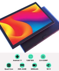 Tableta ZZB YQ10S de 64GB Sistema: Android 11, Tamaño de pantalla: 10.1 pulgadas, CPU: Quad-core 1.5Ghz, Resolución de pantalla: 1280*800 ips +2.5D, Tecnología de pantalla: pantalla de vidrio G + G completo, Pantalla táctil: táctil capacitiva multitáctil, Equipo: Altavoz integrado, ROM: 64GB (la tarjeta TF se puede ampliar a 512GB), RAM: 2GB, Píxel: cámara frontal de 2MP + cámara trasera de 8MP, Conexión inalámbrica: Wi-Fi: IEEE 802.11 b/g/n 2.4GHz WIFI, Bluetooth 4.2, hotspot, Batería: 6000 mAh, Cargador: 5V2A + cable USB-C.
