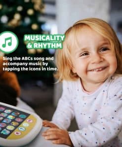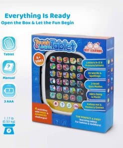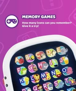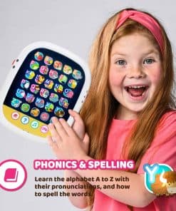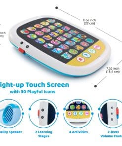 Esta tableta de aprendizaje ofrece actividades para aprender el alfabeto, deletreo, resolución de problemas, emociones, coordinación mano-ojo, pronunciación, música, formas y memoria. Fácil de usar para niños de dos años con dos etapas de aprendizaje y control de volumen. Requiere 3 pilas AAA incluidas, ideal para niños pequeños de 2 años en adelante.