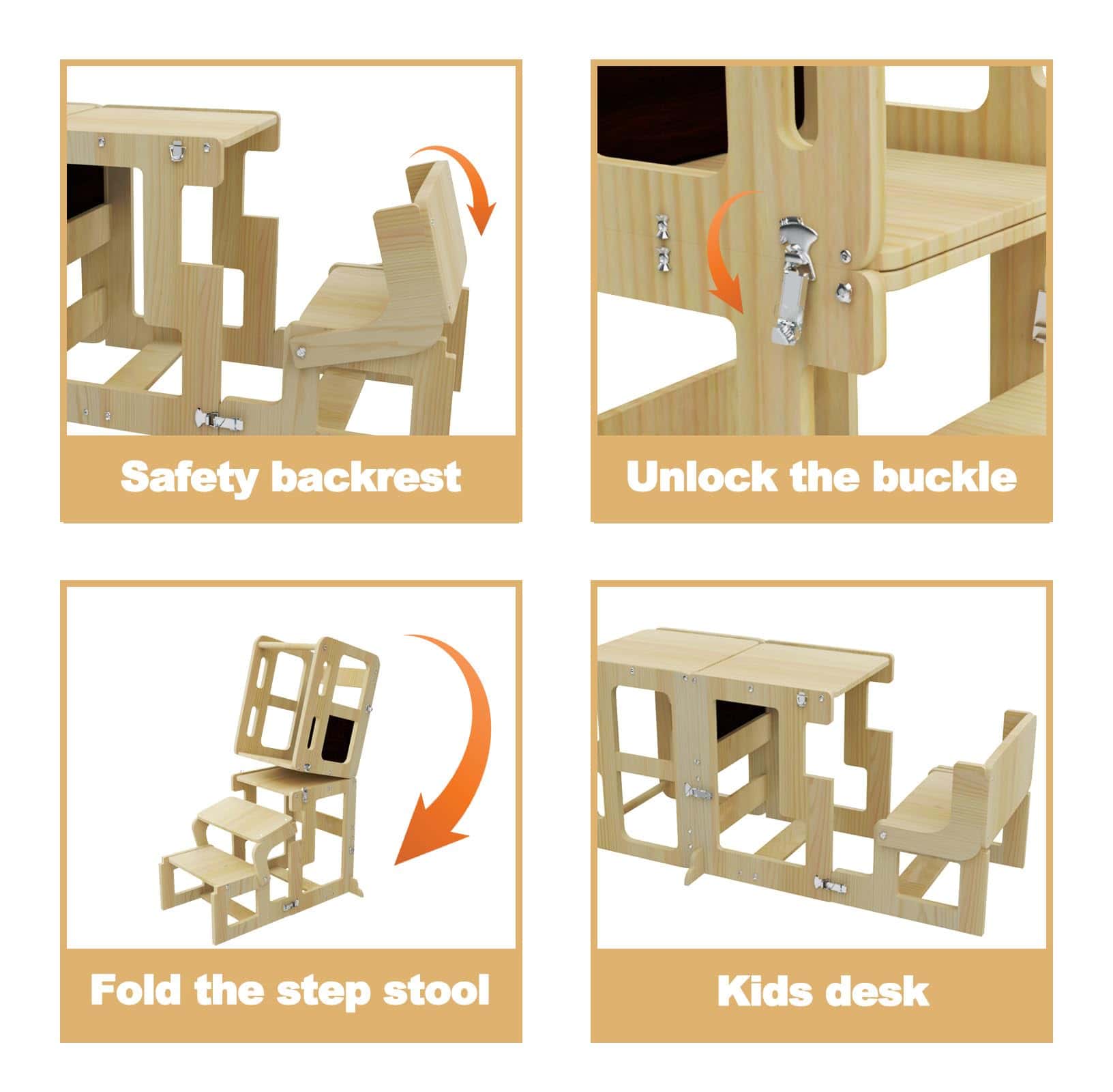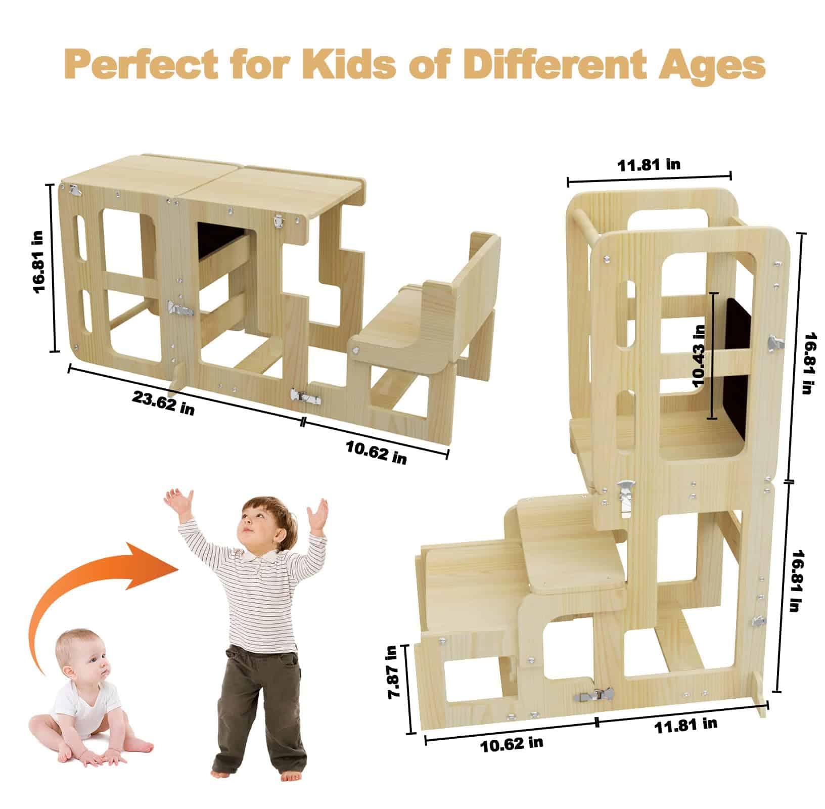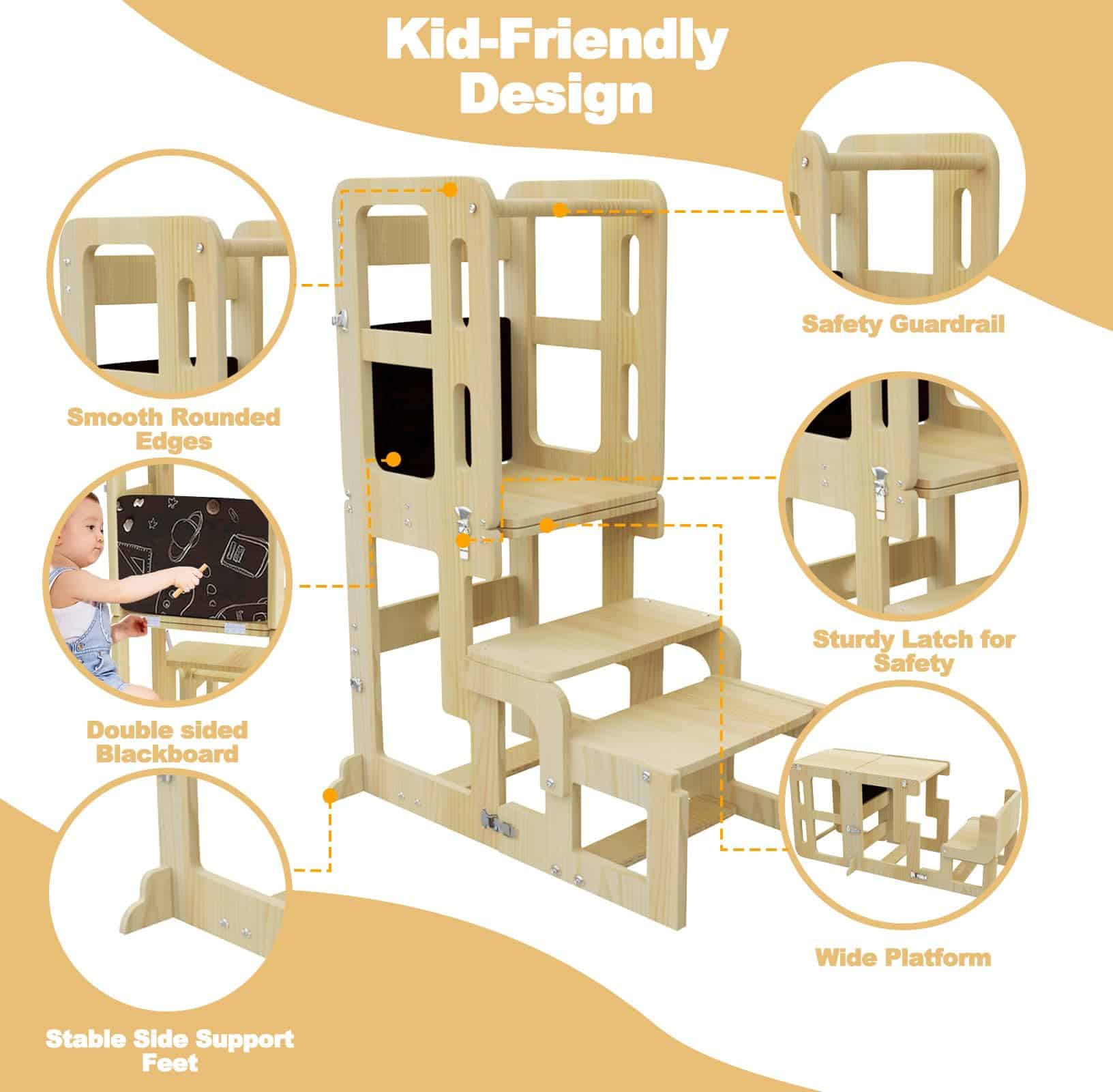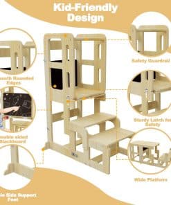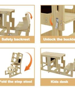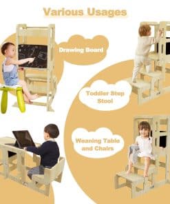 Ya sea que su hijo le esté ayudando a mezclar ingredientes, estudiando con tentempiés en la mesa y la silla, o siendo creativo en la pizarra, este taburete de cocina para niños ofrece infinitas posibilidades de diversión y aprendizaje.