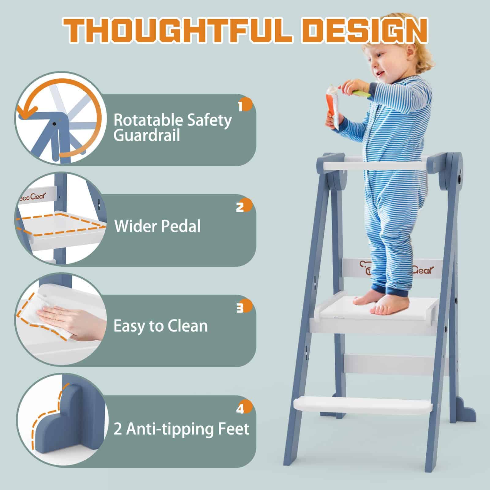 3. ALMACENAMIENTO COMPACTO: El diseño de ahorro de espacio del taburete de cocina para niños se pliega completamente para un almacenamiento conveniente cuando no está en uso. Simplemente despliéguelo para divertirse en la cocina.